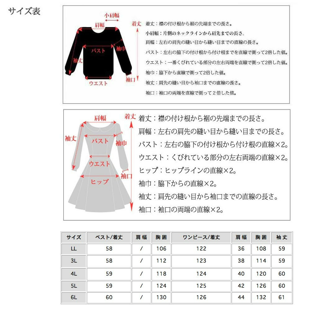 サイズ表記 LL 3L 4L 5L 6L ベスト着丈 58cm 58cm 59cm 59cm 60cm 胸囲 108cm 114cm 120cm 126cm 132cm ワンピース着丈 122cm 123cm 124cm 125cm 126cm 肩幅 36cm 38cm 40cm 42cm 44cm 胸囲 108cm 114cm 120cm 126cm 132cm 袖丈 59cm 59cm 60cm 60cm 61cm