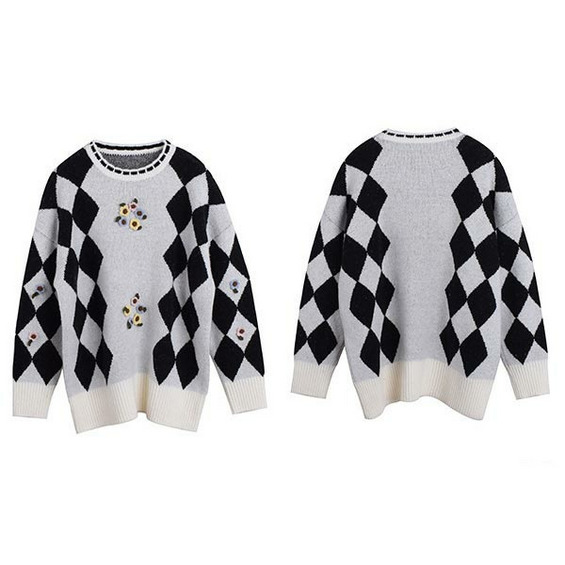 【今だけ10%オフ】レトロなチェック柄とかぎ針編みの花飾り付きニットプルオーバー