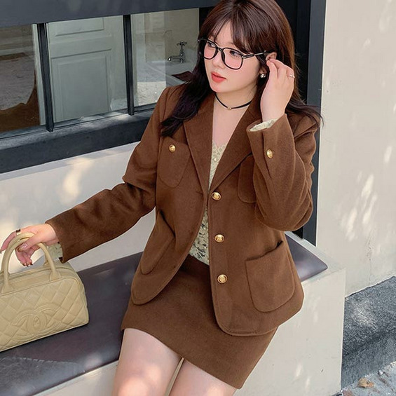 ウールライク素材の秋冬シーズン用スカートスーツ。