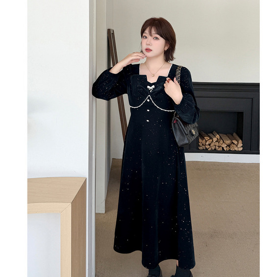 シルバーラメを散りばめたベルベットのフレアワンピース。