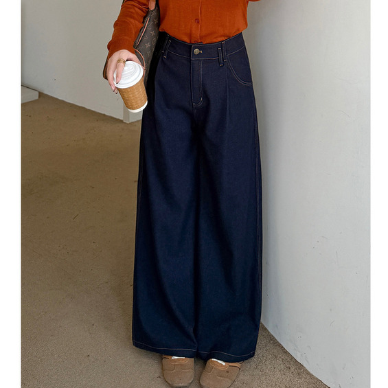 ウエストタック入りのワンウォッシュ綺麗めデニムワイドパンツ