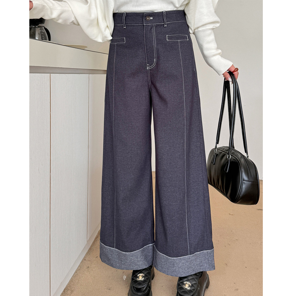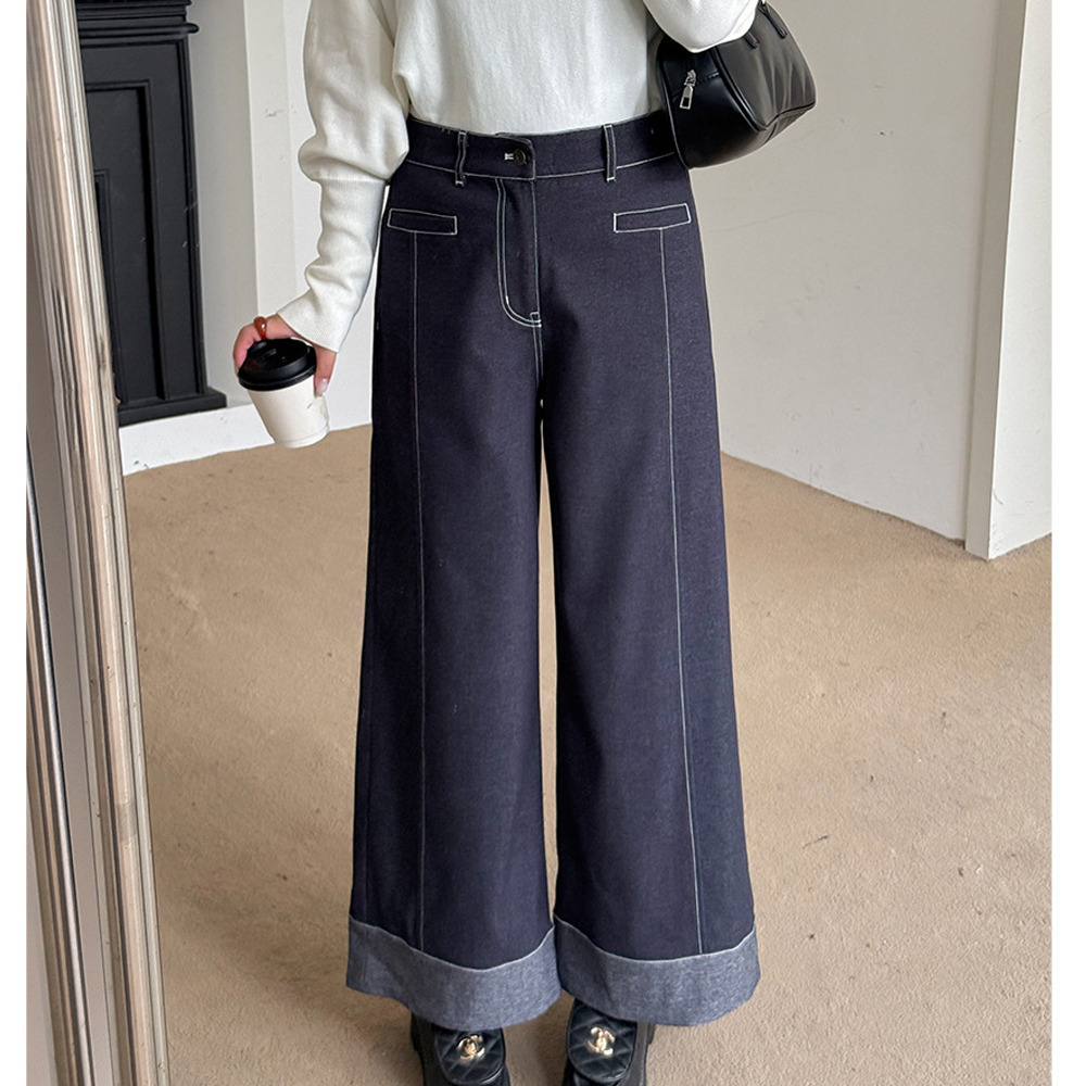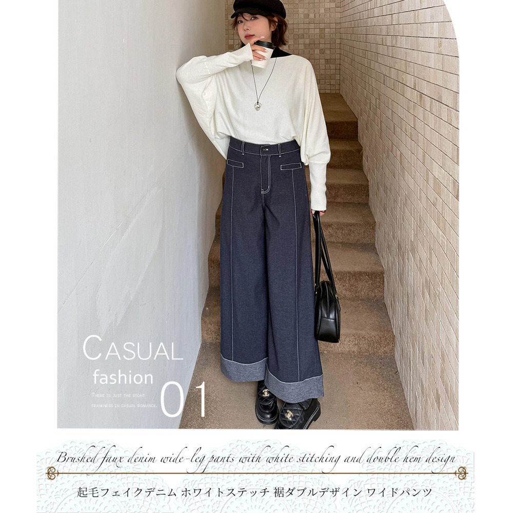 ホワイトステッチがアクセントになった裾折り返しワイドパンツ