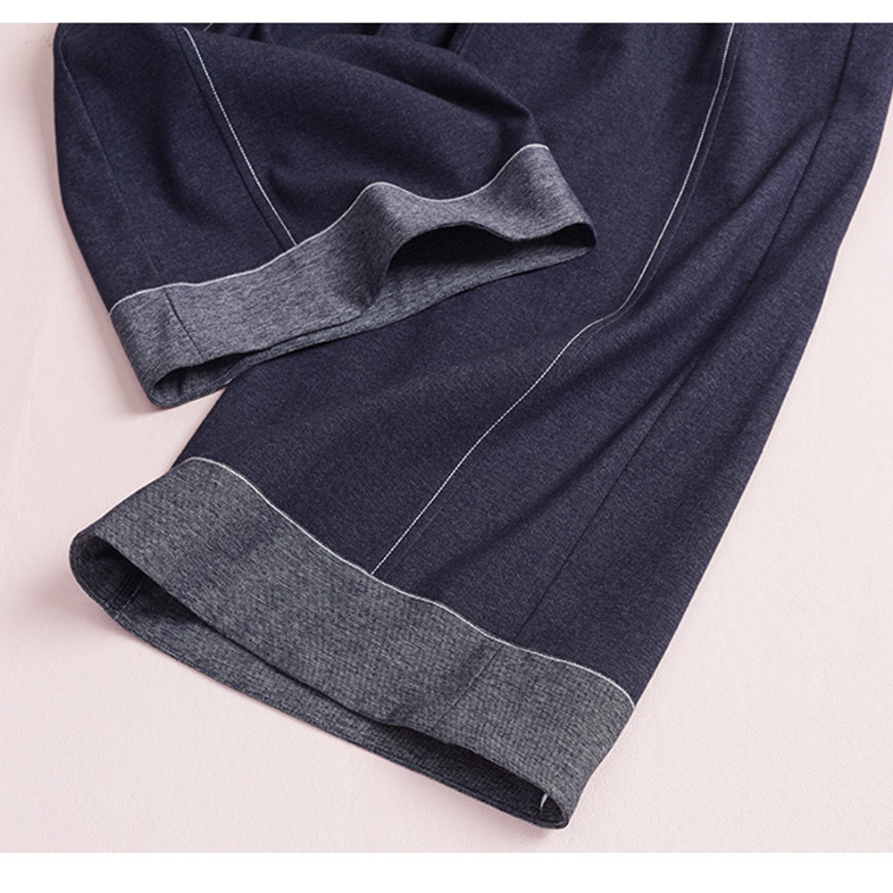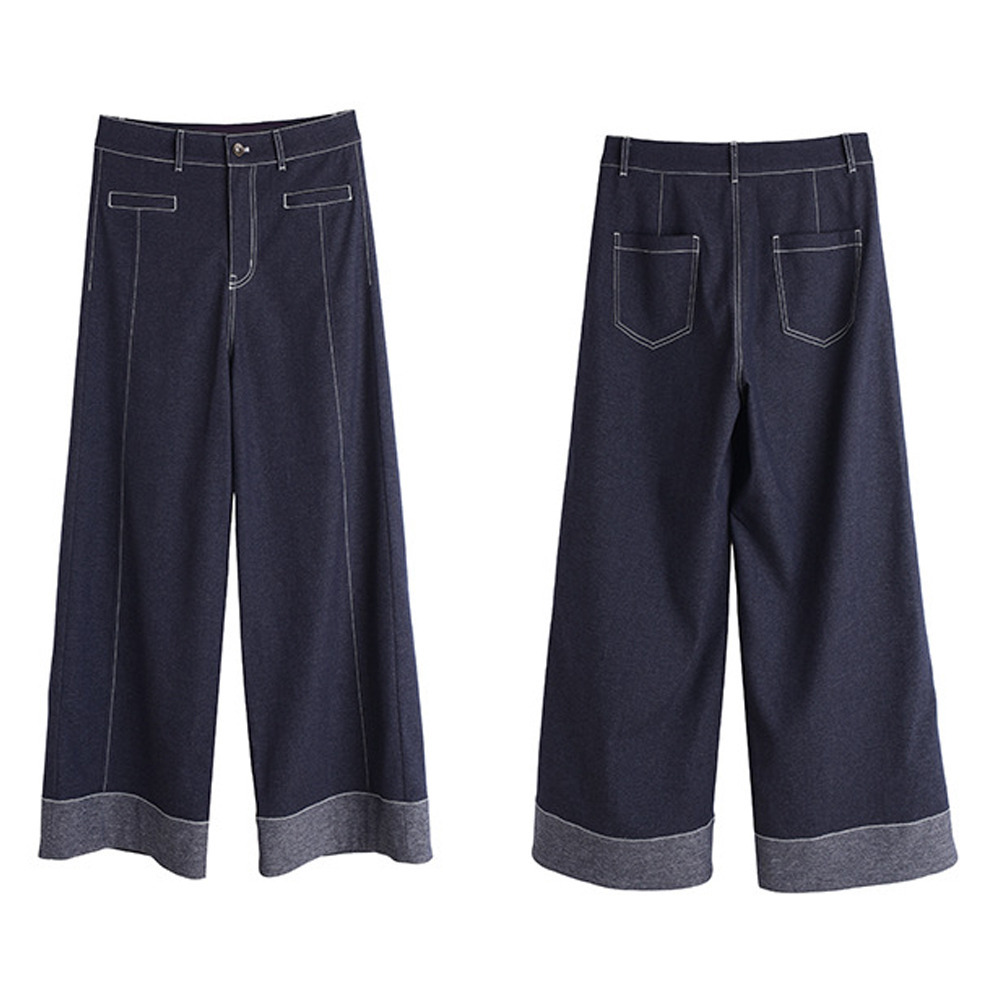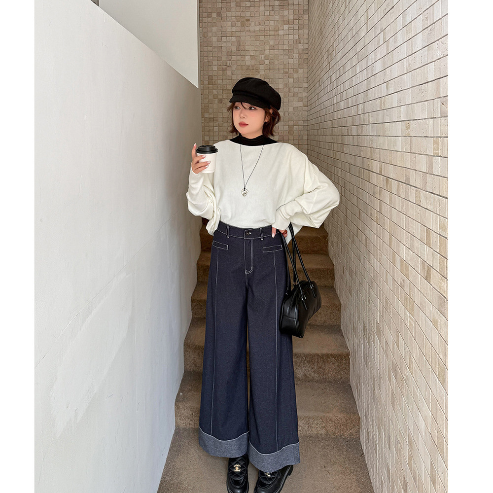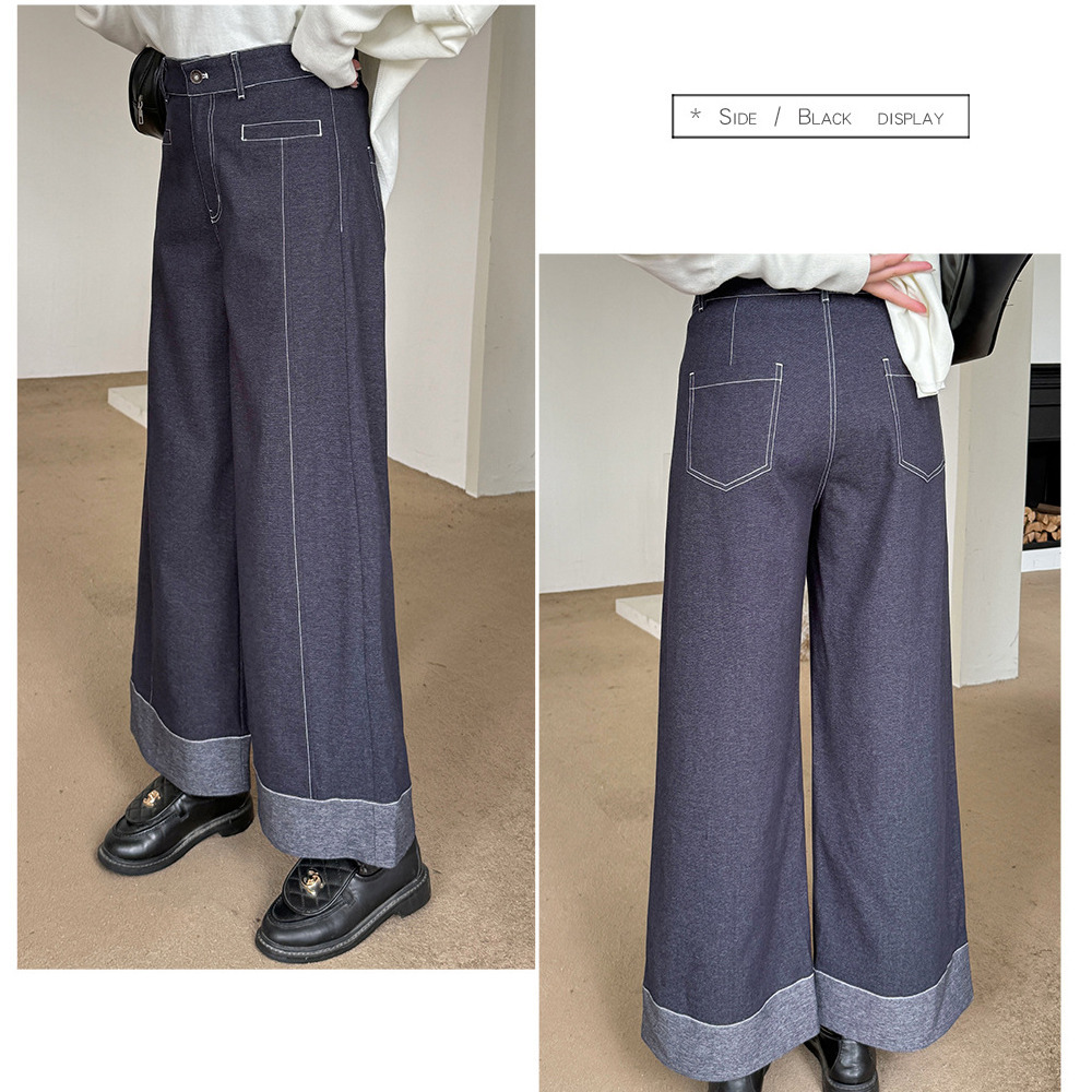 ホワイトステッチがアクセントになった裾折り返しワイドパンツ