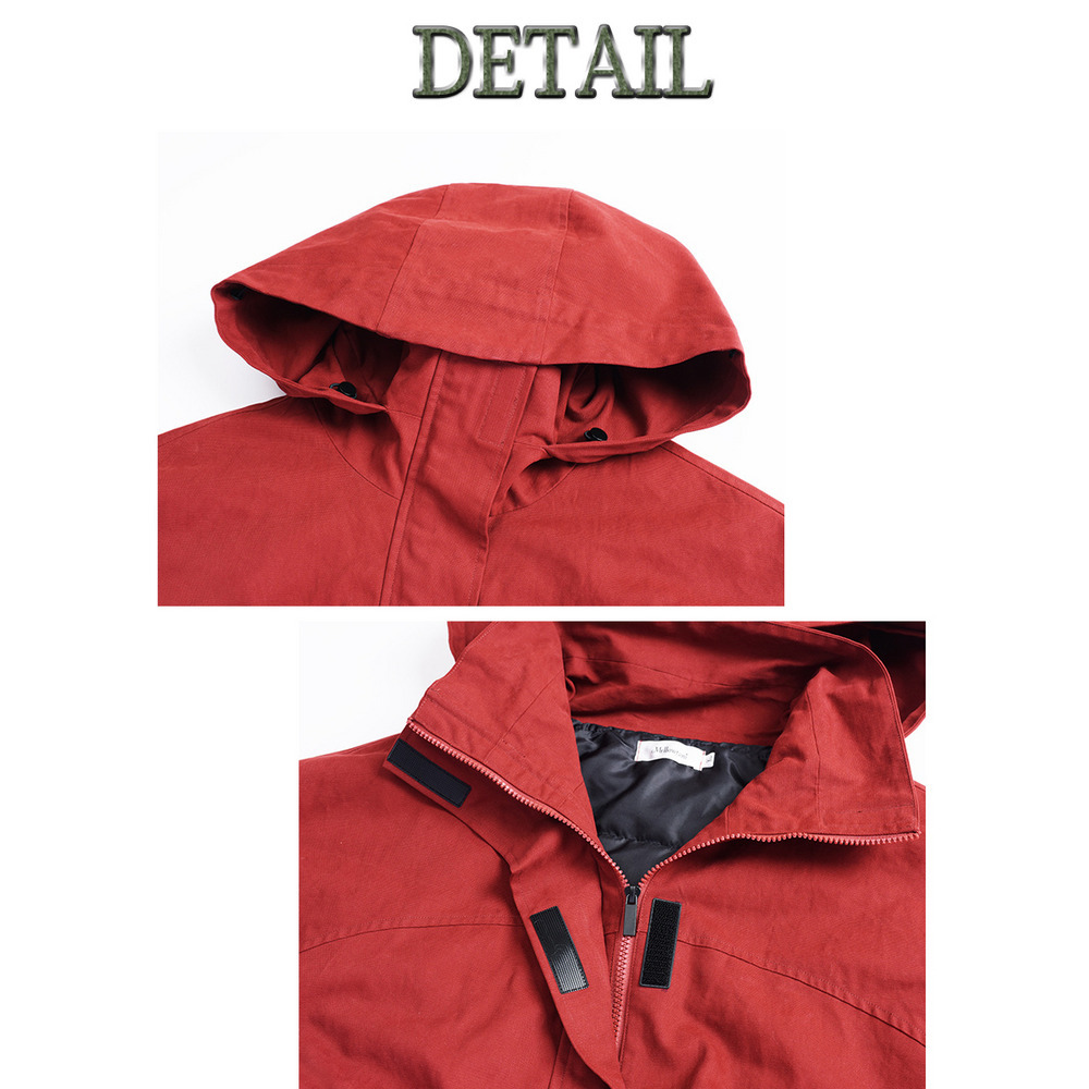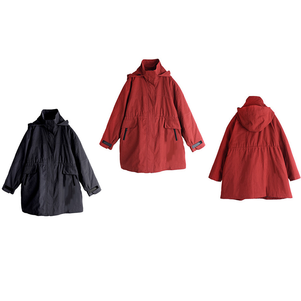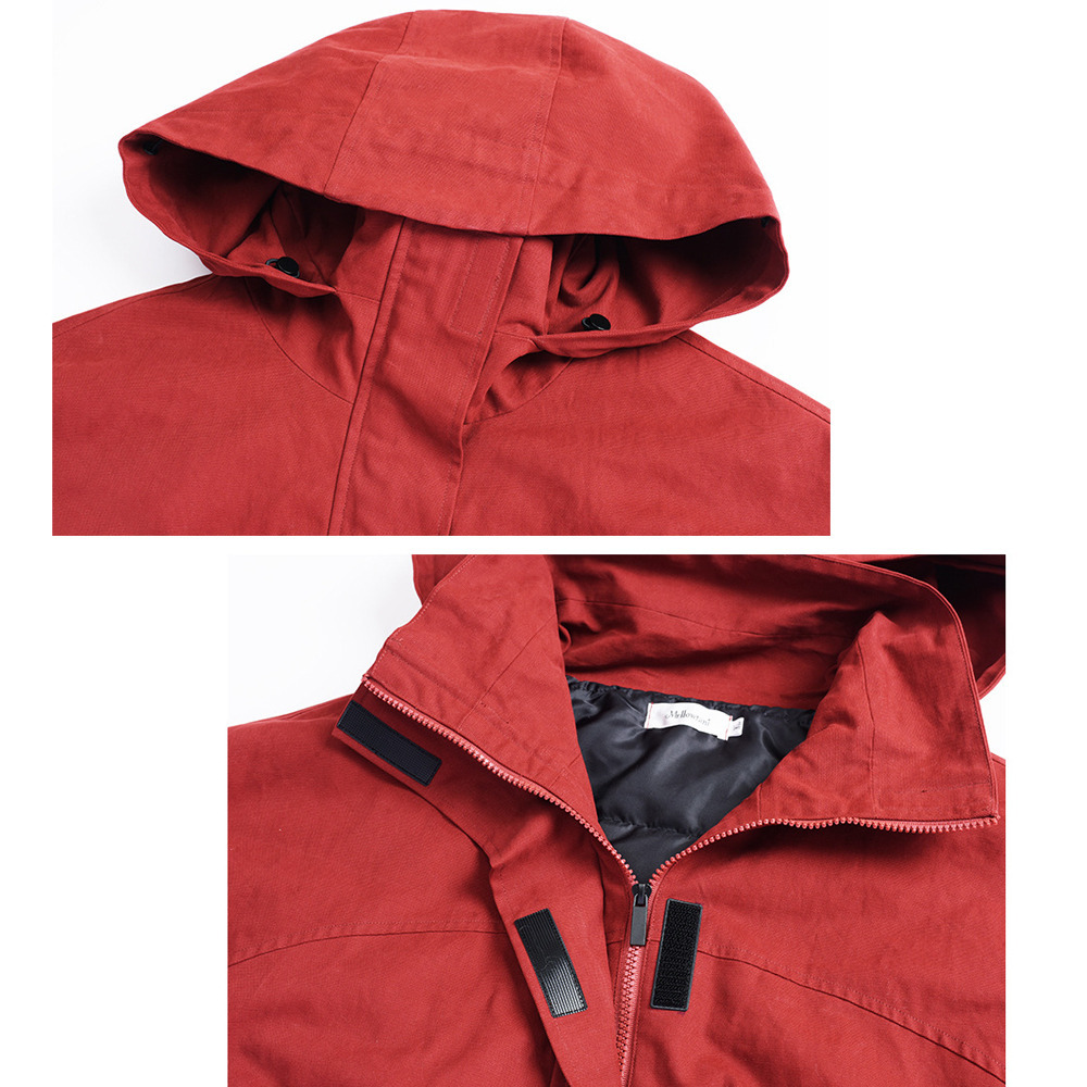 ジッパーを上げるとフード付きのスタンドカラー。