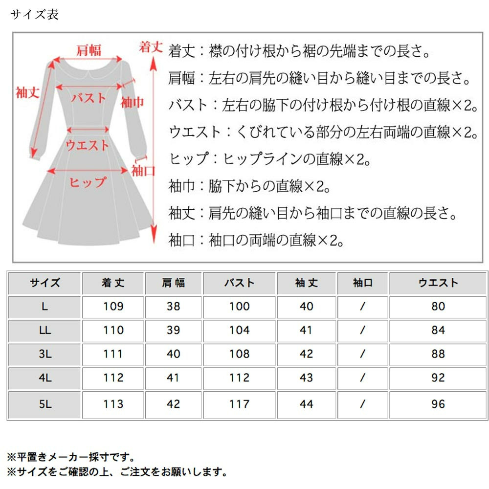 サイズ表記 L LL 3L 4L 5L 着丈 109cm 110cm 111cm 112cm 113cm 肩幅 38cm 39cm 40cm 41cm 42cm バスト 100cm 104cm 108cm 112cm 117cm 袖丈 40cm 41cm 42cm 43cm 44cm ウエスト 80cm 84cm 88cm 92cm 96cm