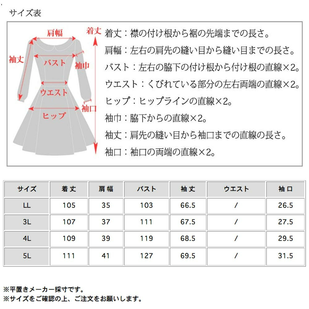 サイズ表記 LL 3L 4L 5L 着丈 105cm 107cm 109cm 111cm 肩幅 35cm 37cm 39cm 41cm バスト 103cm 111cm 119cm 127cm 袖丈 66.5cm 67.5cm 68.5cm 69.5cm 袖口 26.5cm 27.5cm 29.5cm 31.5cm
