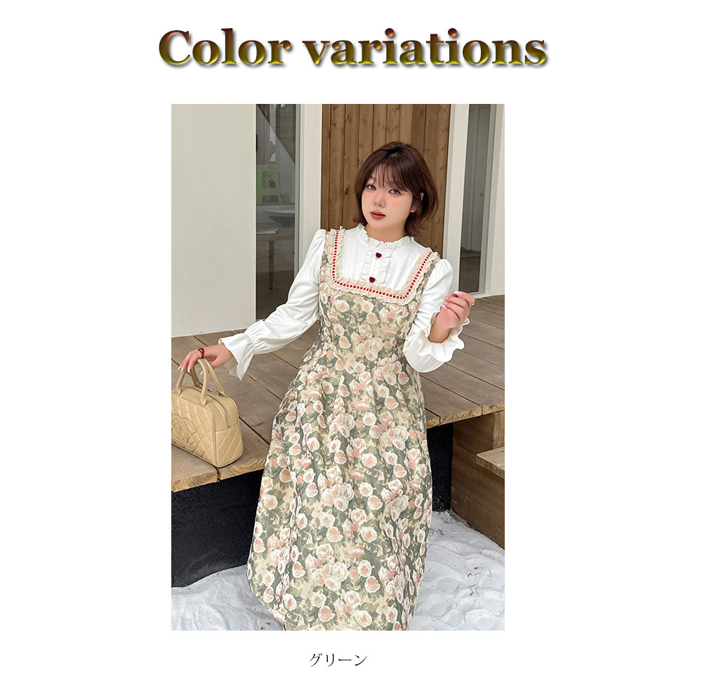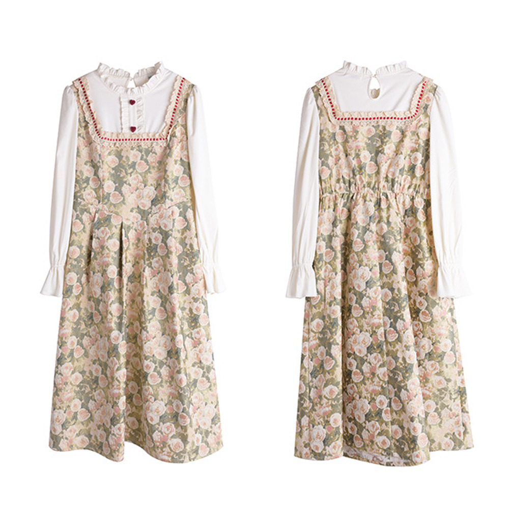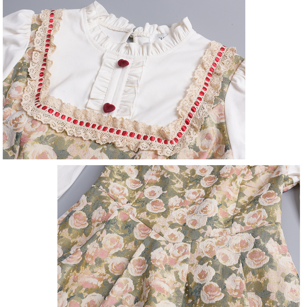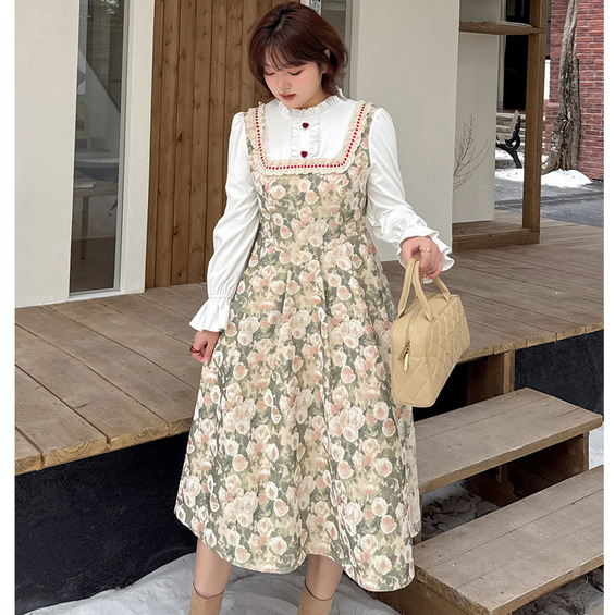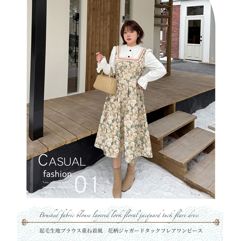 起毛生地ブラウス重ね着風のレトロな花柄ジャガードワンピース