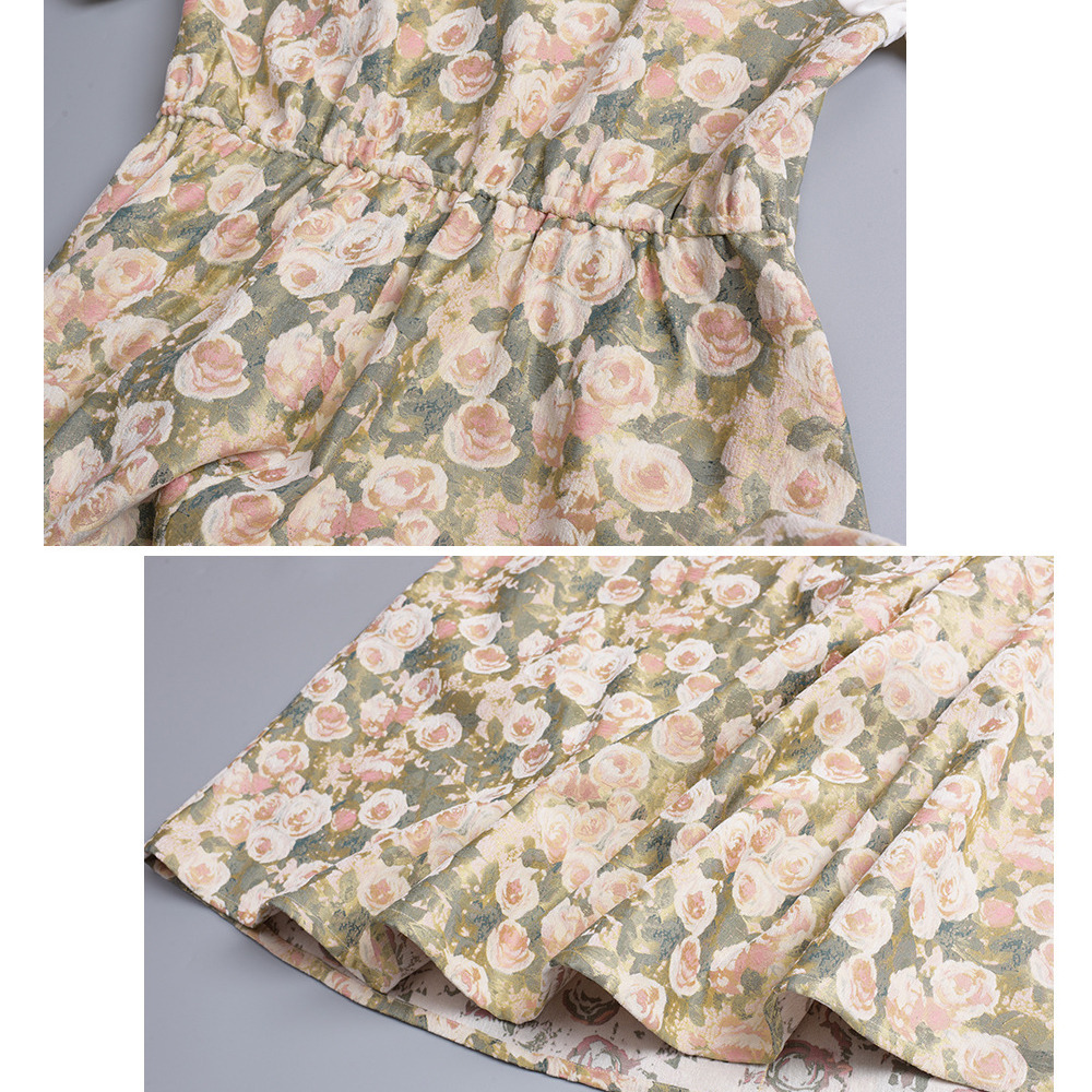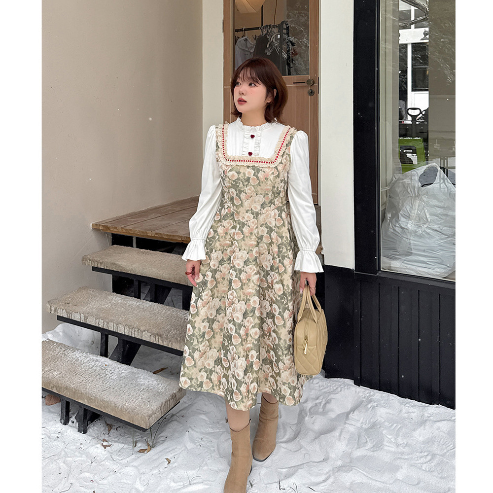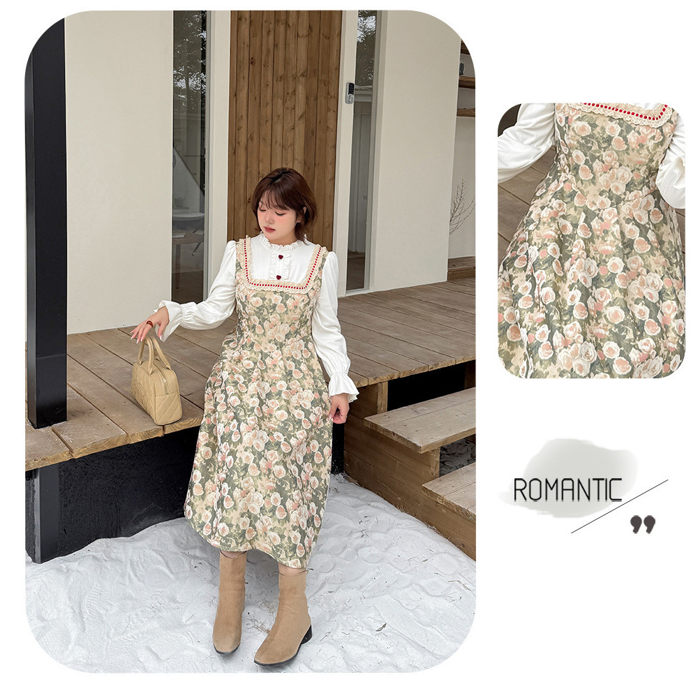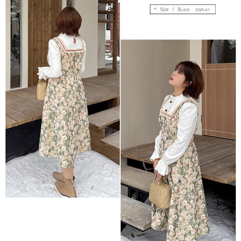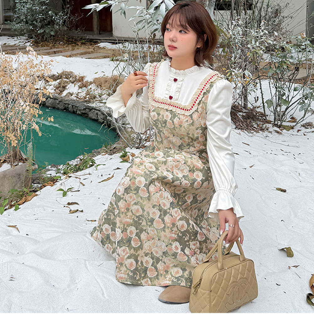 起毛生地ブラウス重ね着風のレトロな花柄ジャガードワンピース