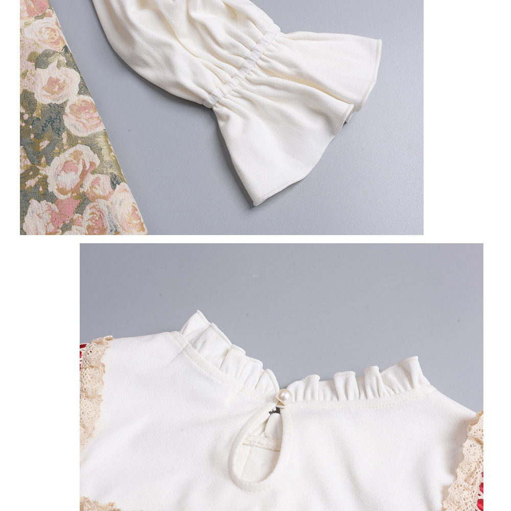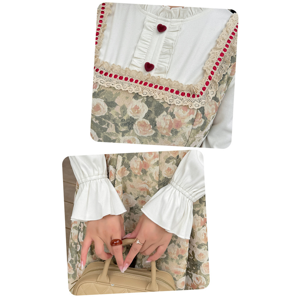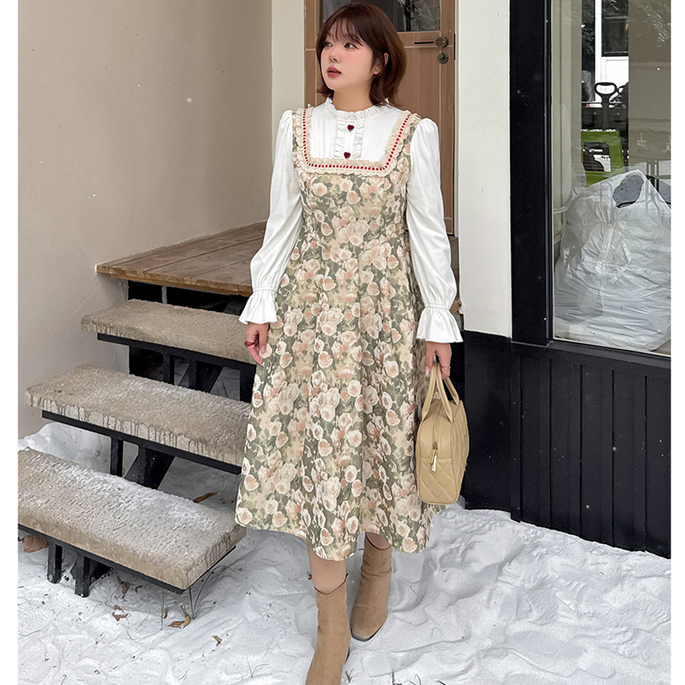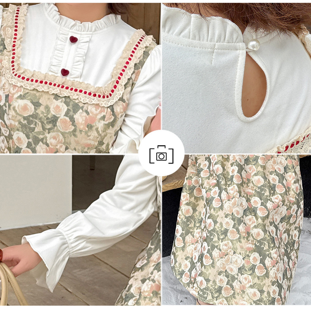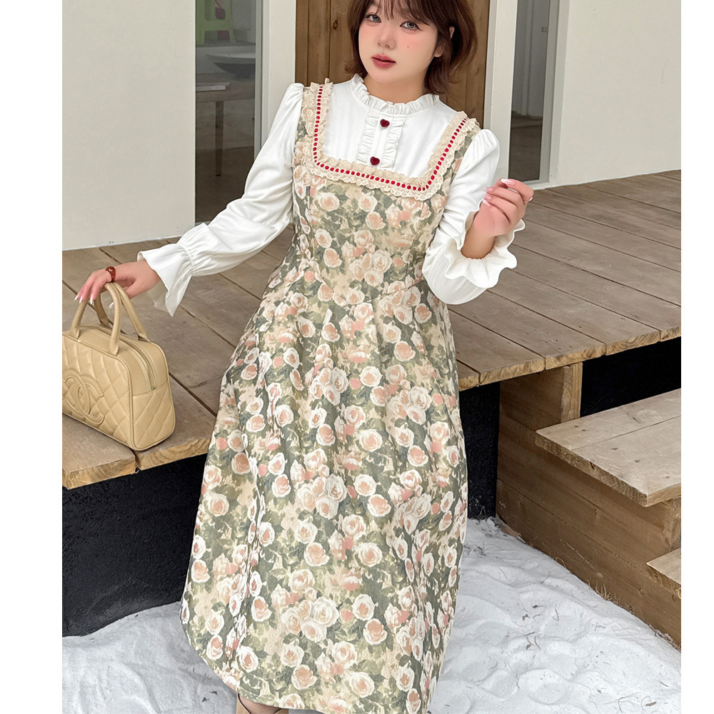 起毛生地ブラウス重ね着風のレトロな花柄ジャガードワンピース