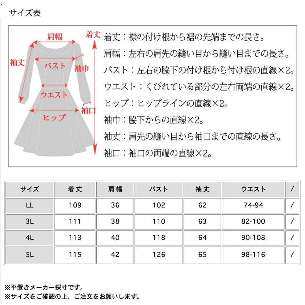 サイズ表記 LL 3L 4L 5L 着丈 109cm 111cm 113cm 115cm 肩幅 36cm 38cm 40cm 42cm バスト 102cm 110cm 118cm 126cm 袖丈 62cm 63cm 64cm 65cm ウエスト 74-94cm 82-100cm 90-108cm 98-116cm