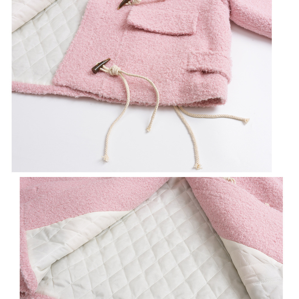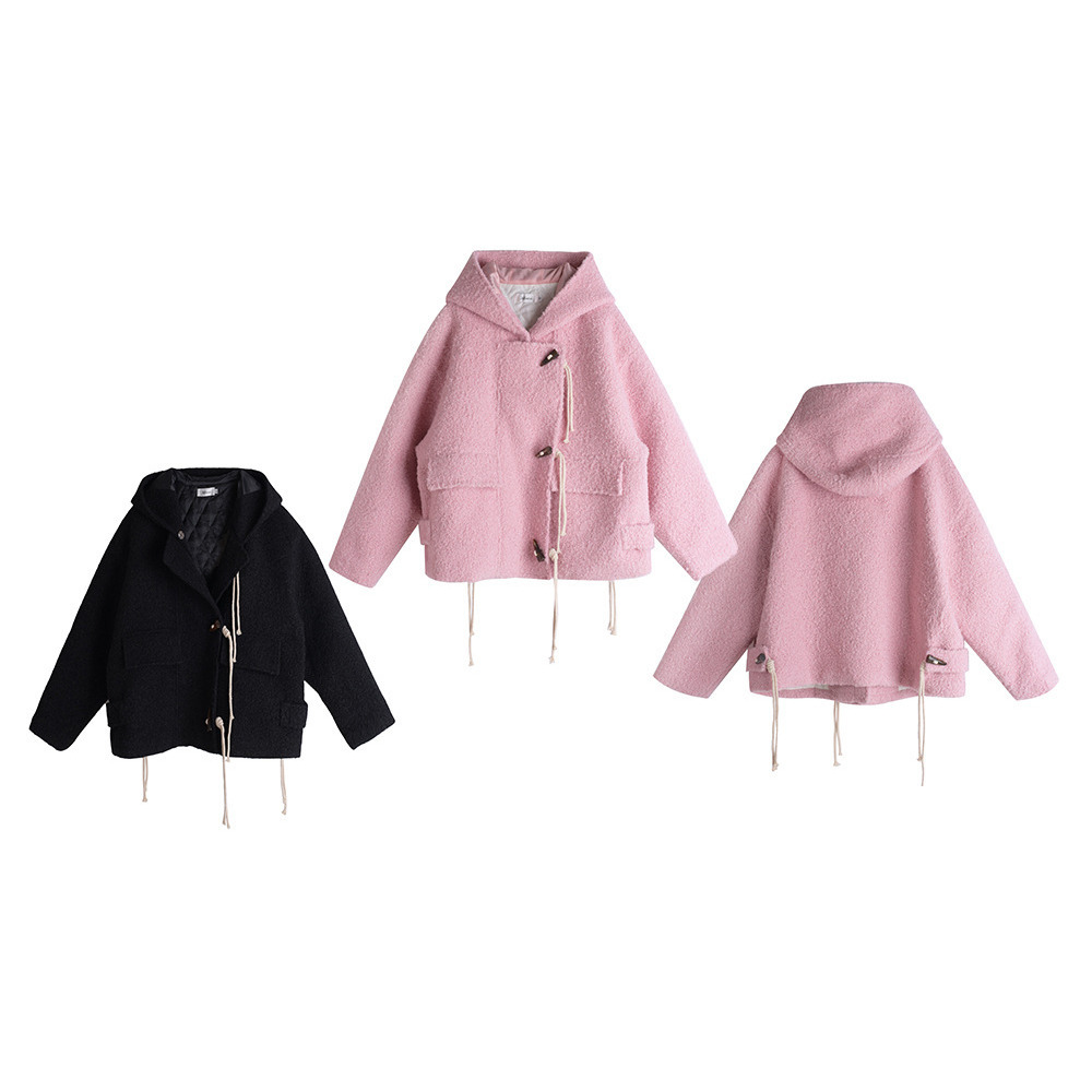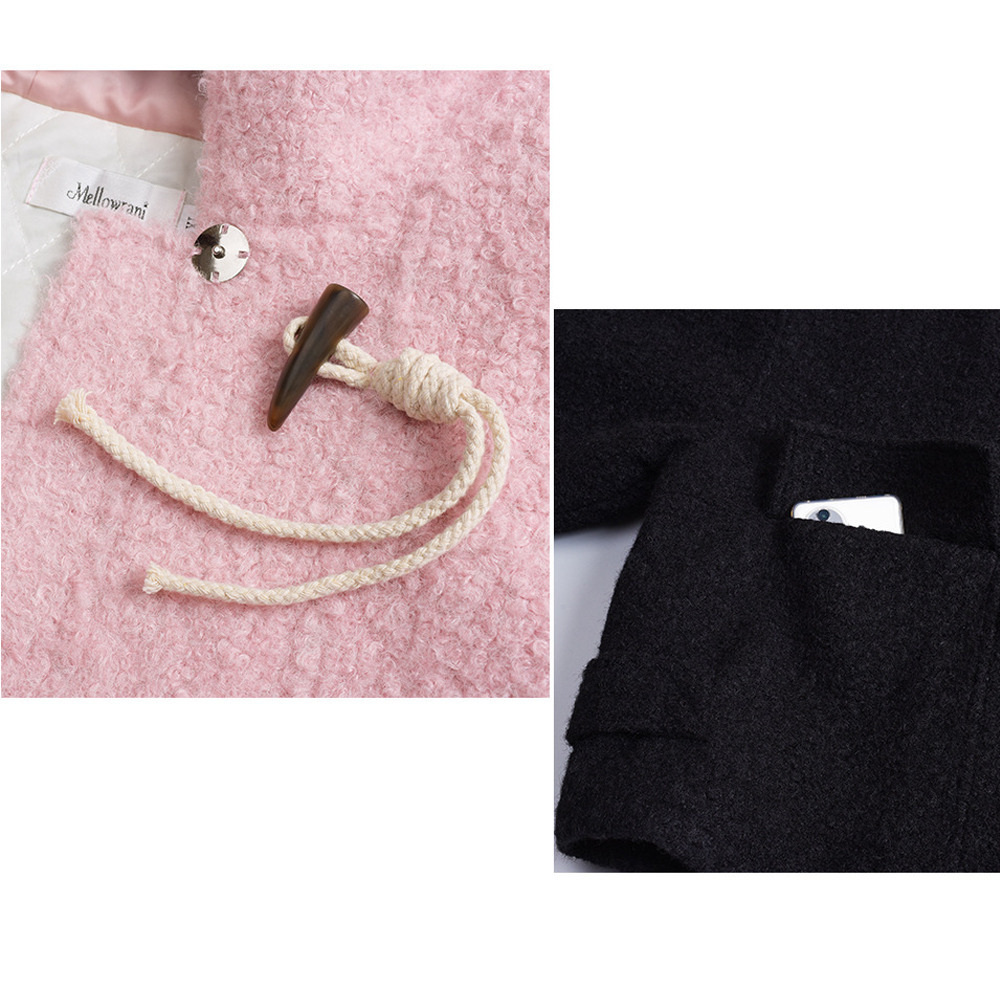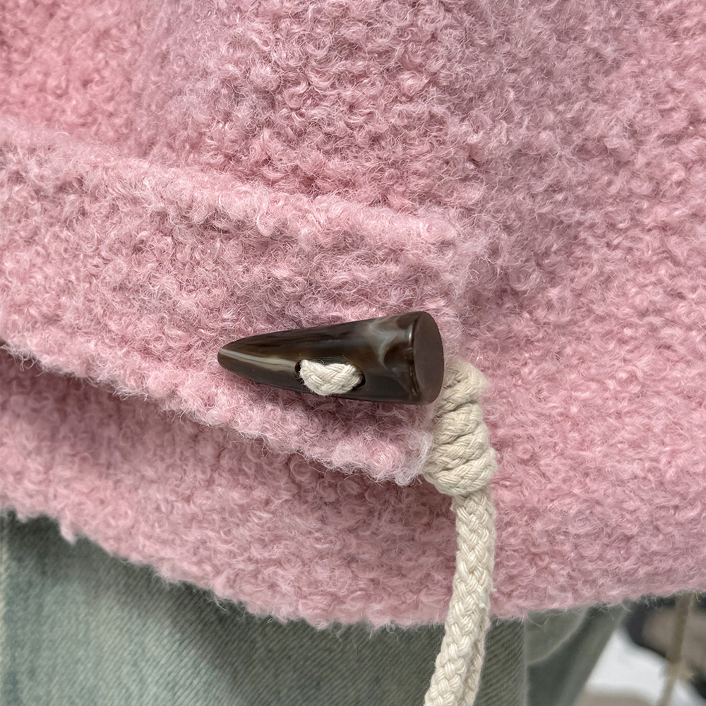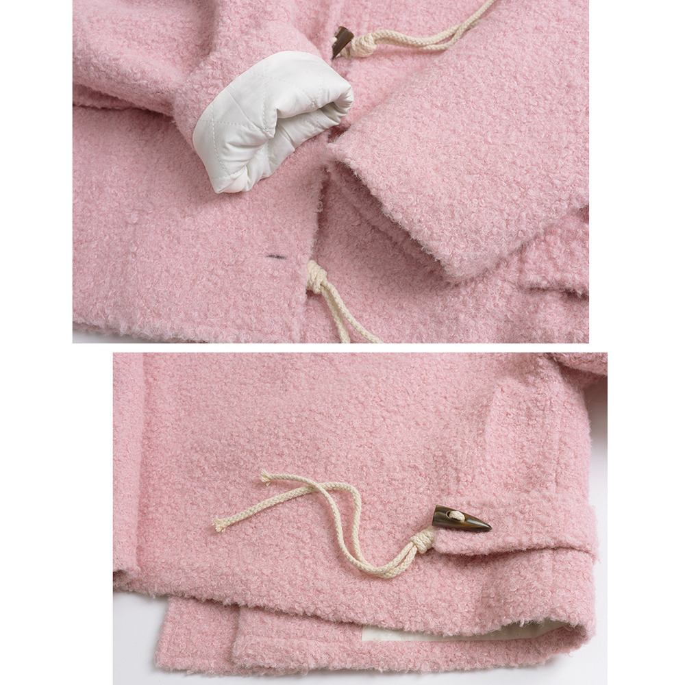 凹凸のあるブークレ生地でコード付きのトグルボタンもアクセント。