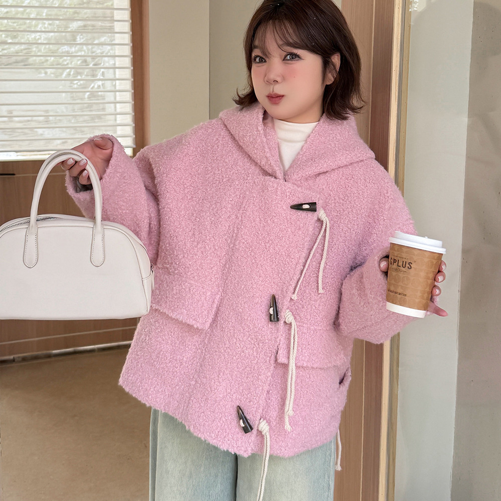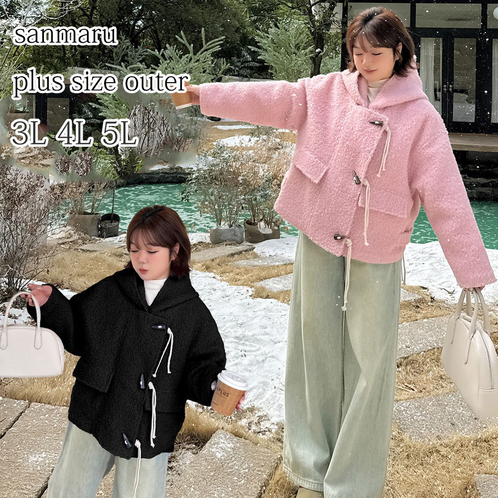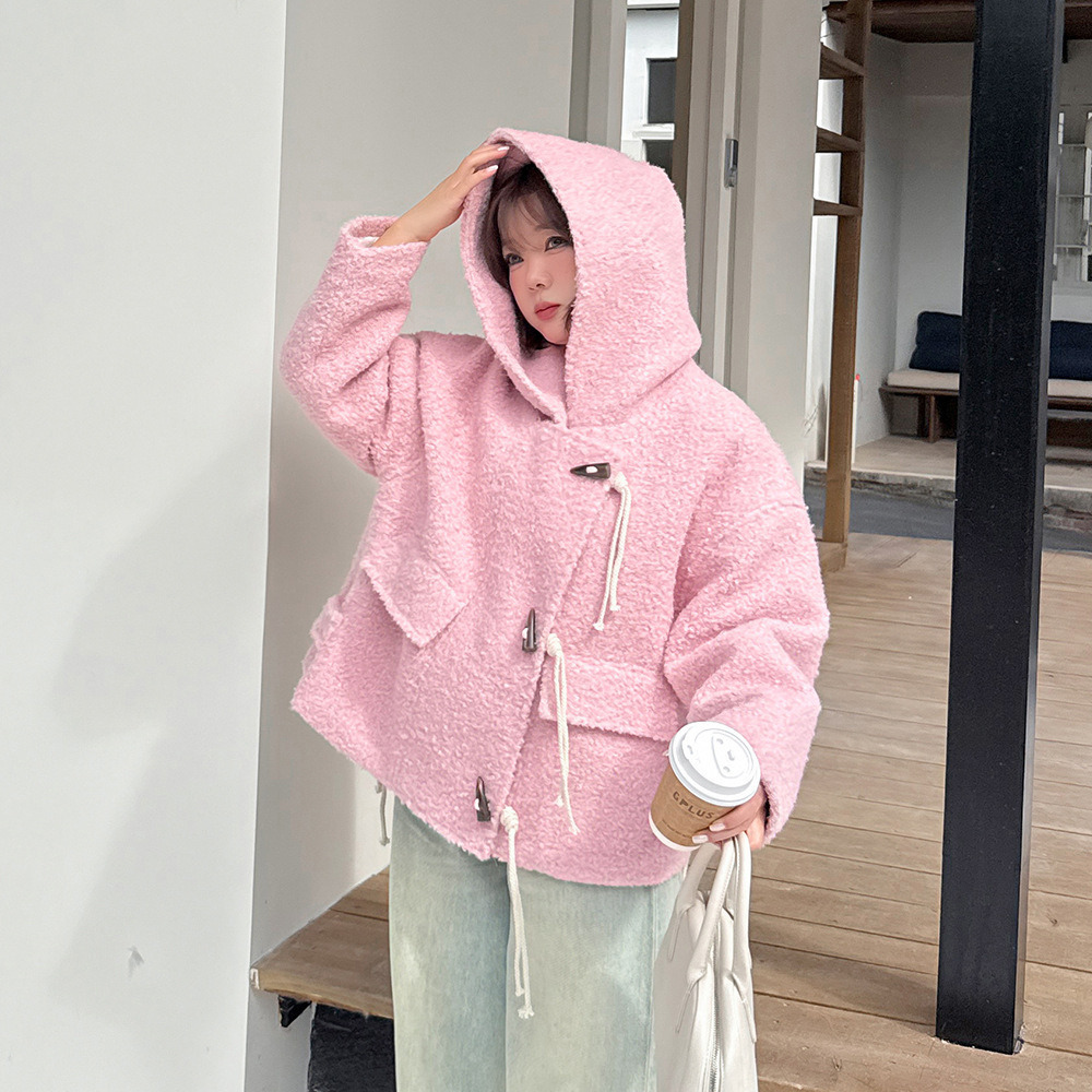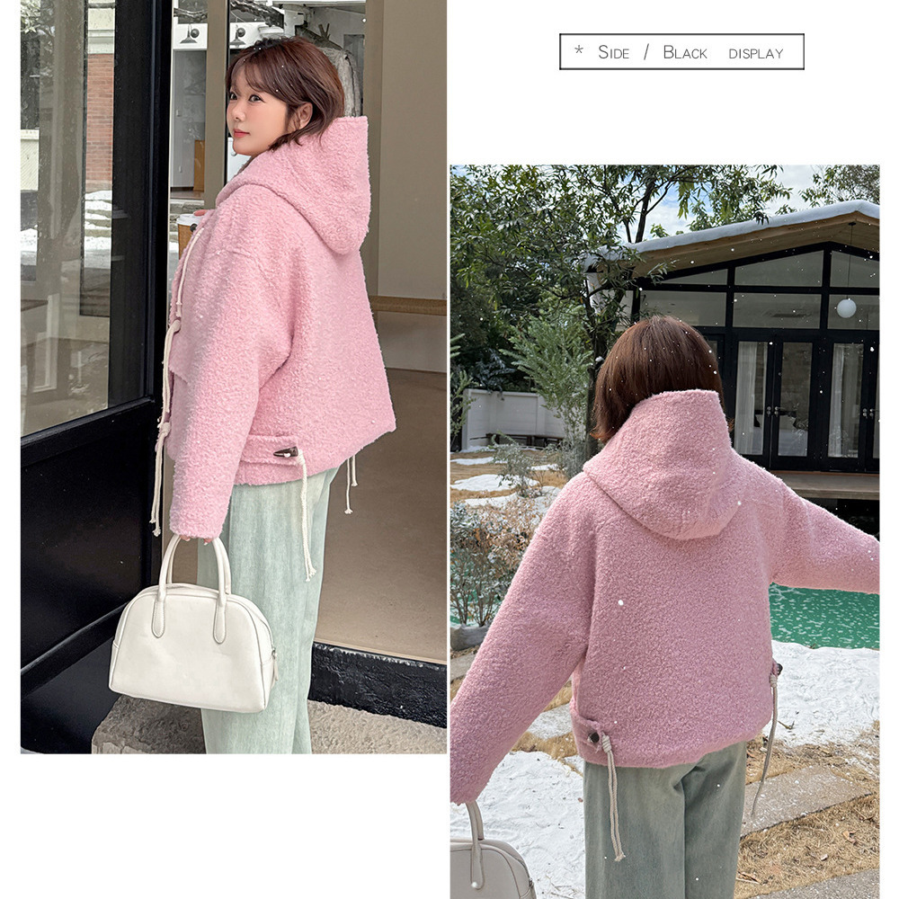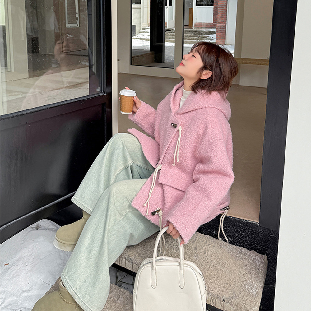 凹凸のあるブークレ生地でコード付きのトグルボタンもアクセント。