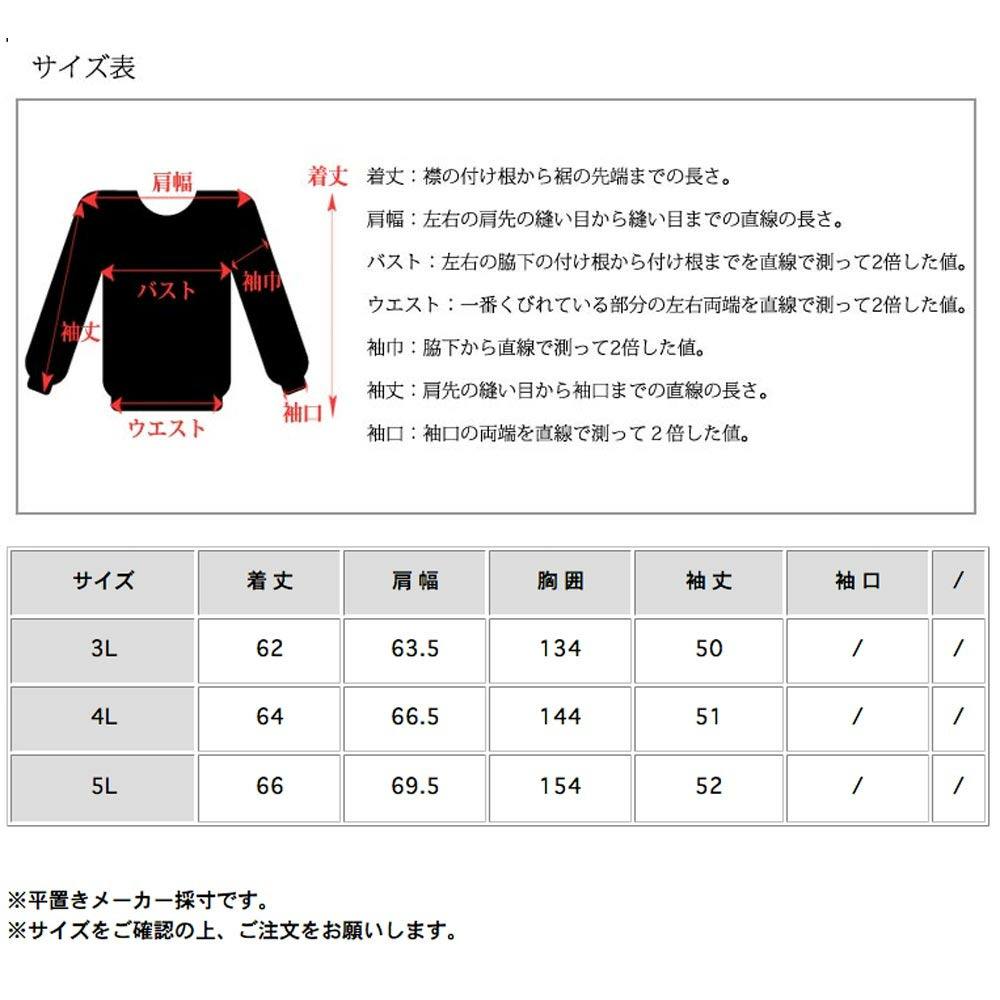 サイズ表記 3L 4L 5L 着丈 62cm 64cm 66cm 肩幅 63.5cm 66.5cm 69.5cm 胸囲 134cm 144cm 154cm 袖丈 50cm 51cm 52cm