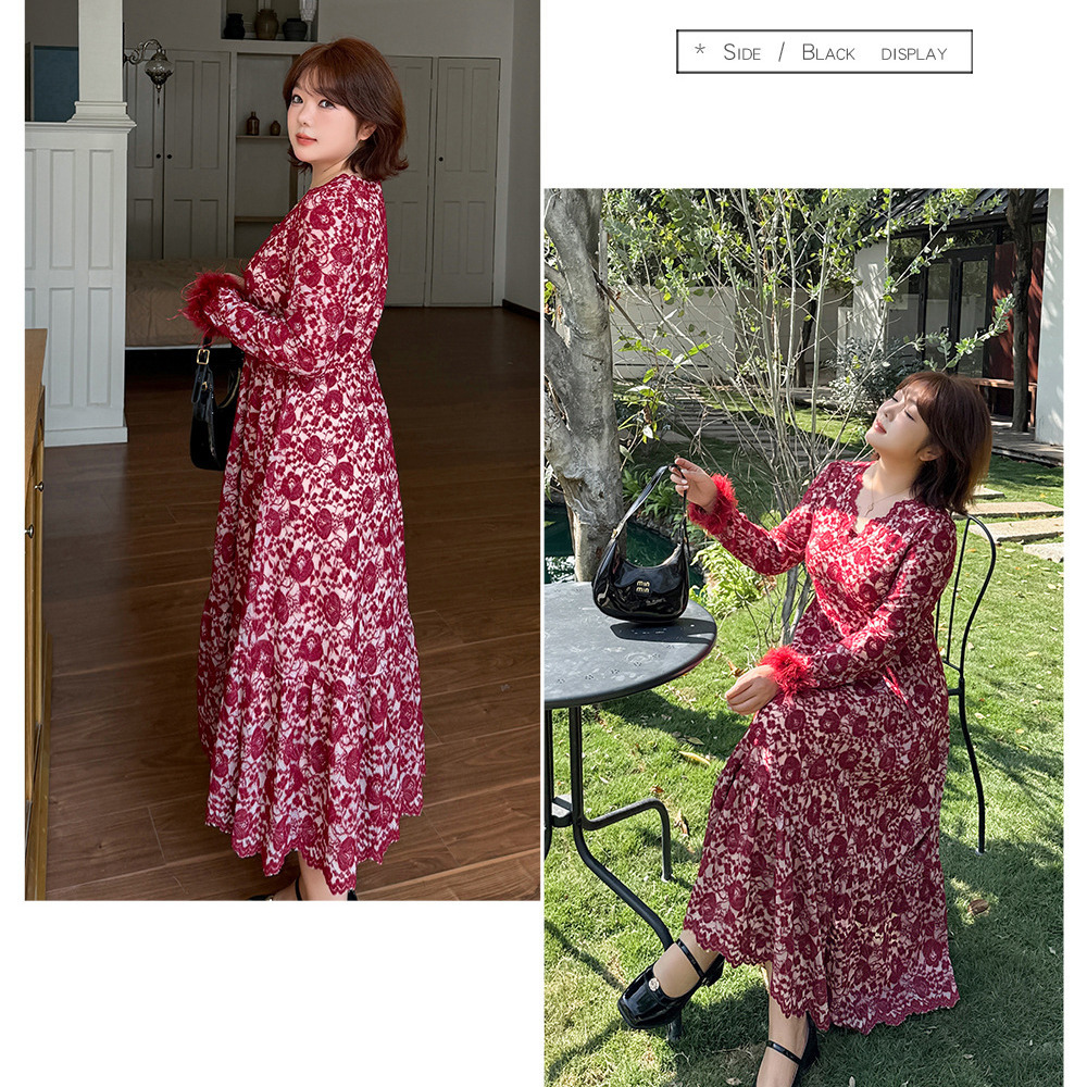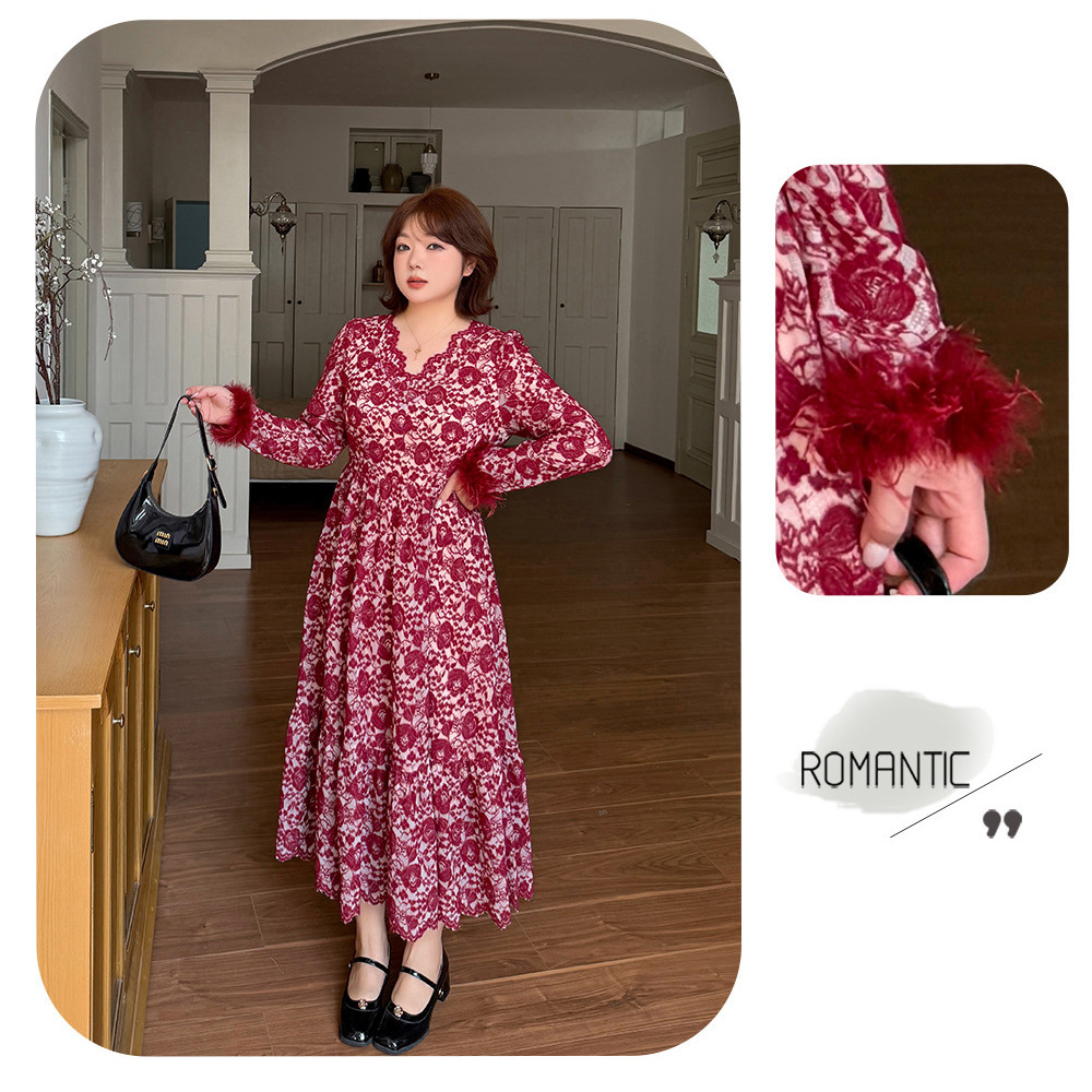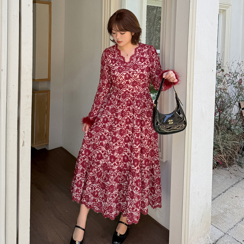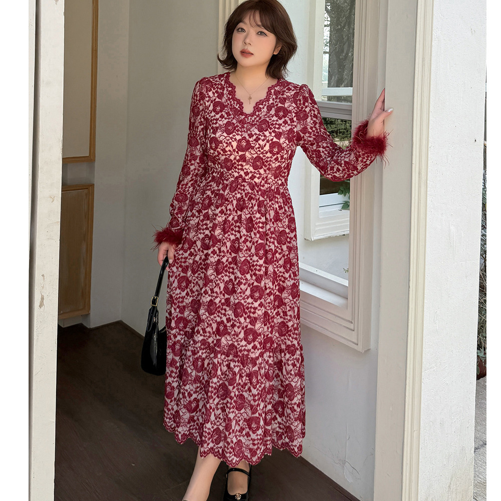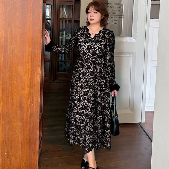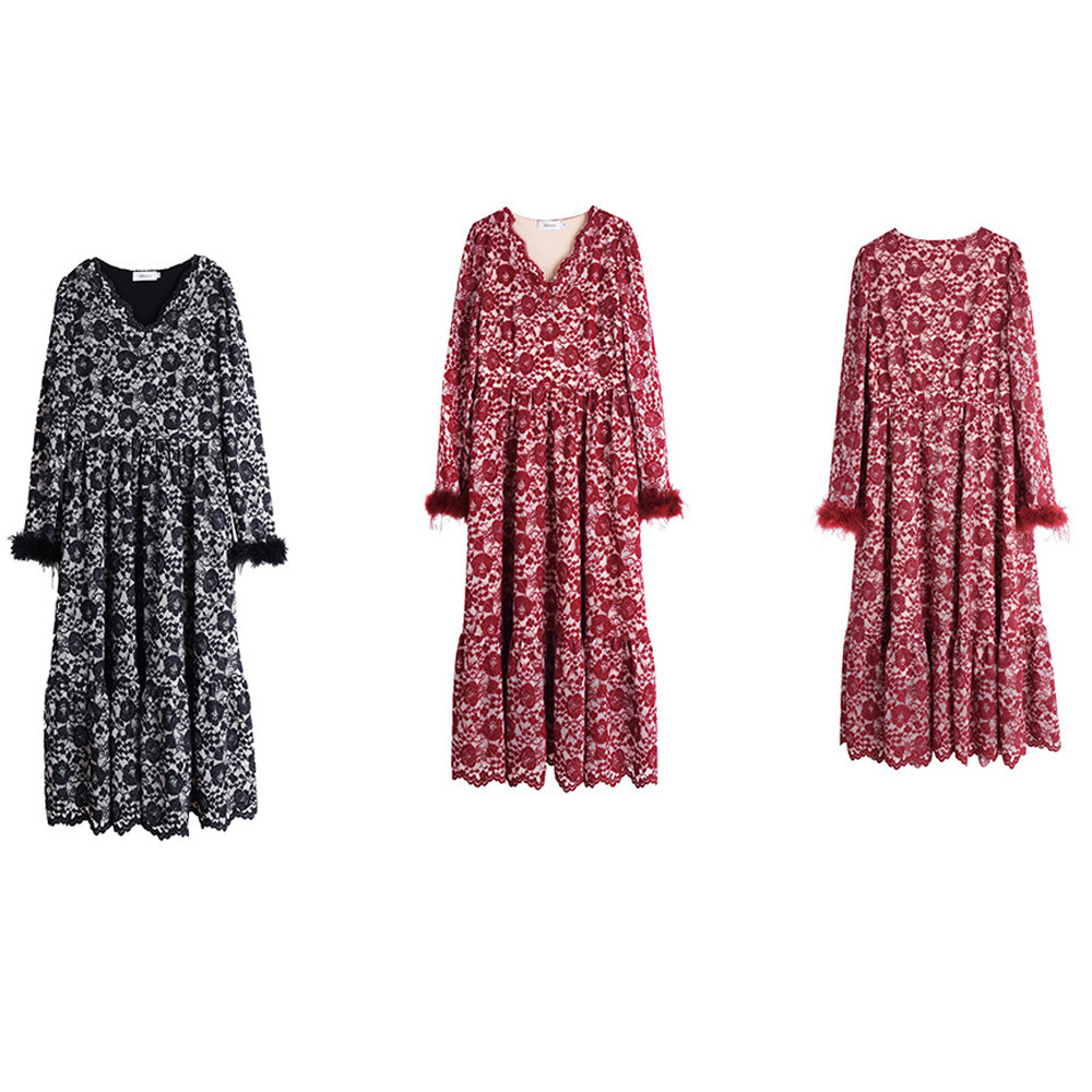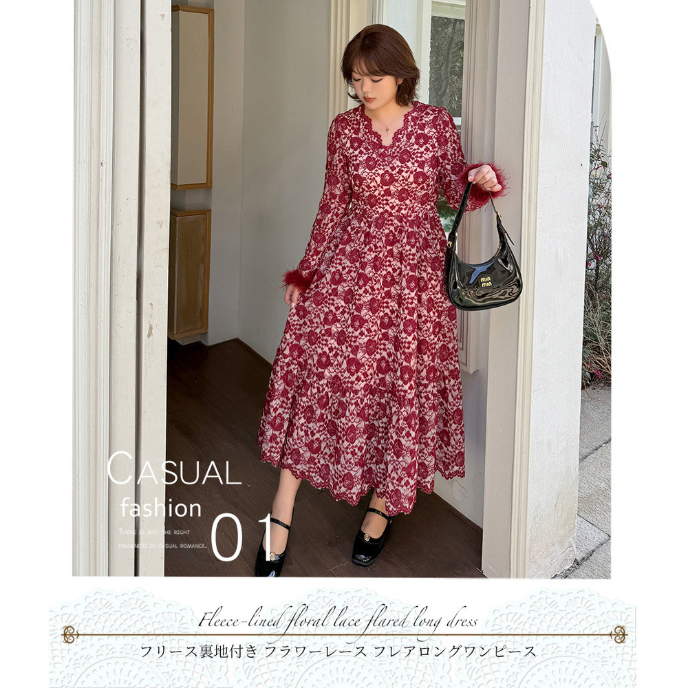 暖かなフリース裏地付き 花柄レースのエレガントなフレアワンピース