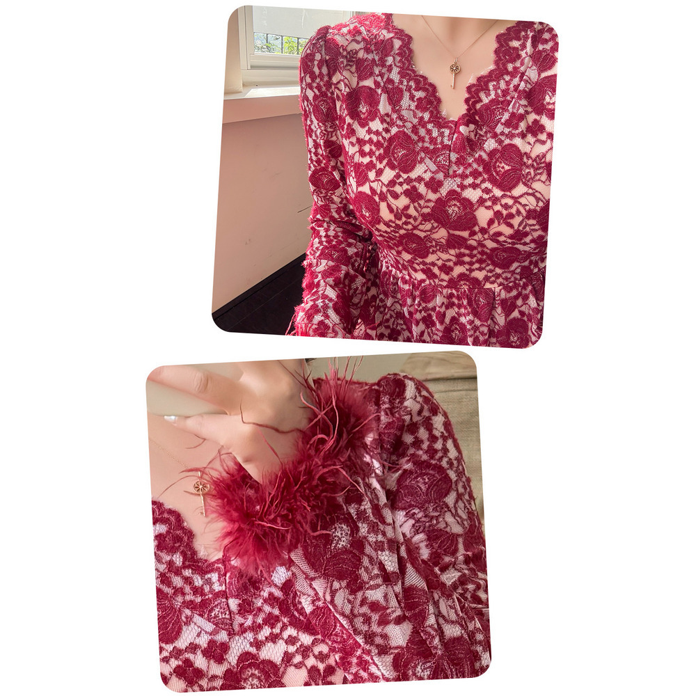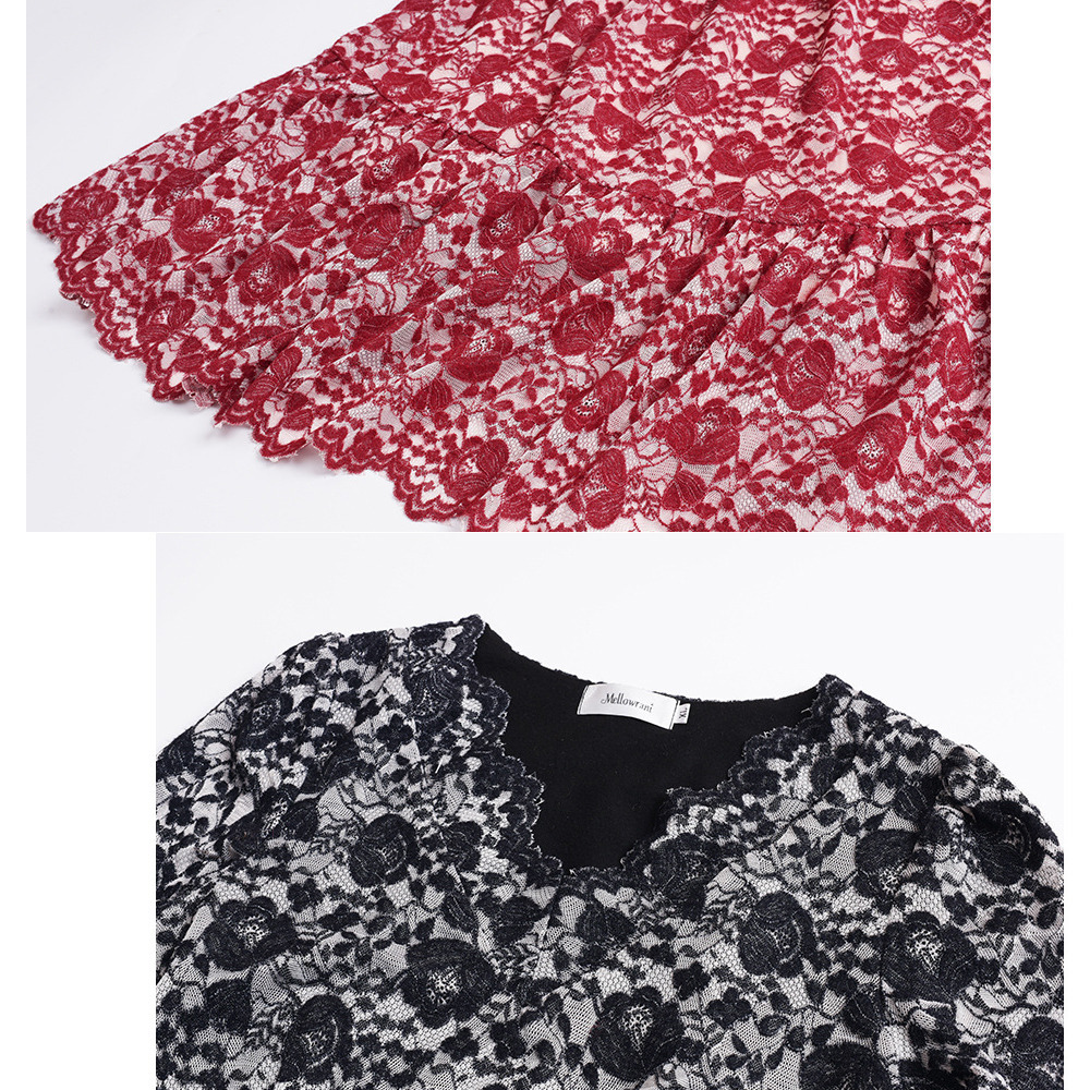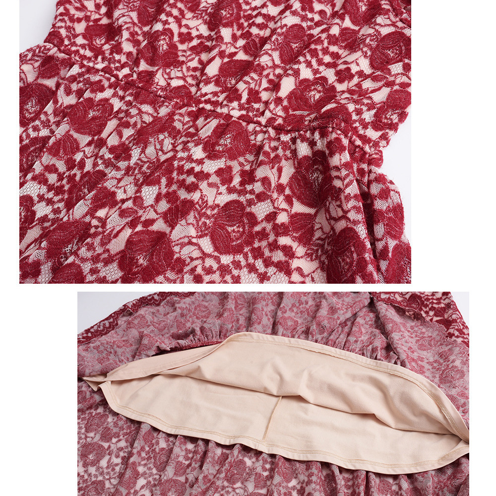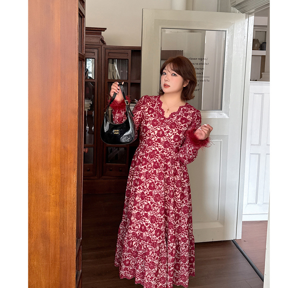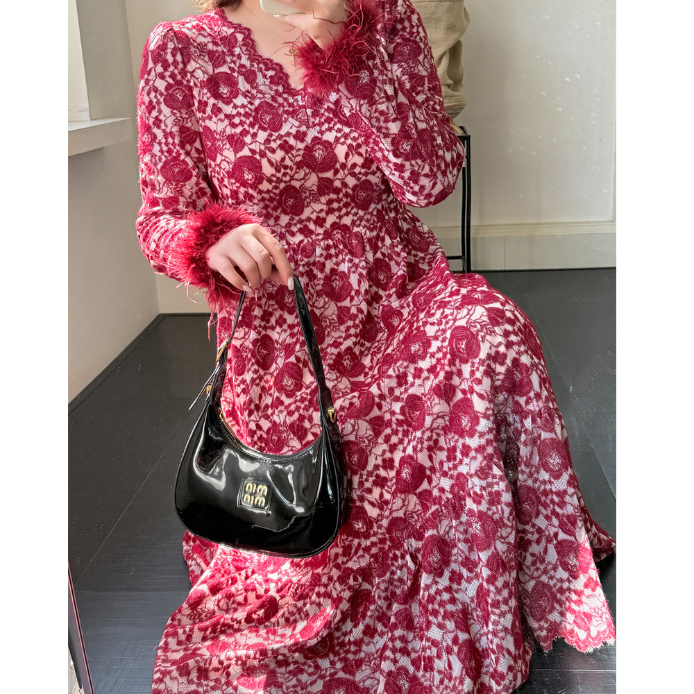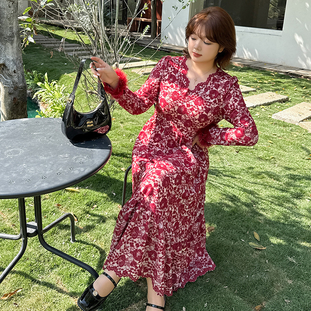 暖かなフリース裏地付き 花柄レースのエレガントなフレアワンピース