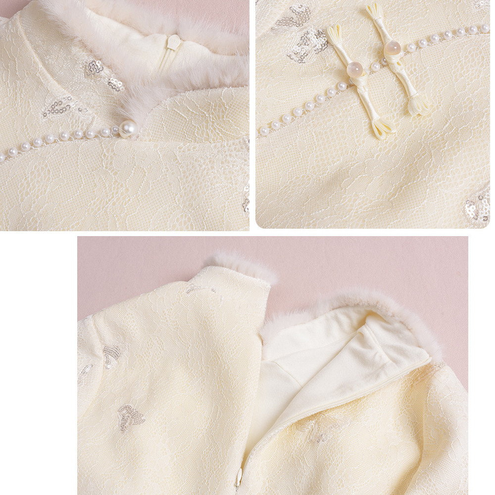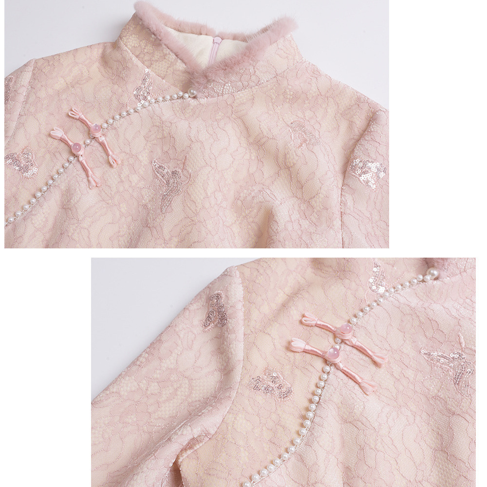 • 暖かなフリース裏地付き レース複合素材のチャイナ風ワンピース3