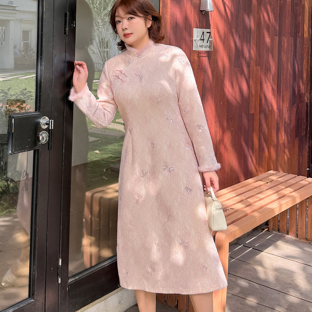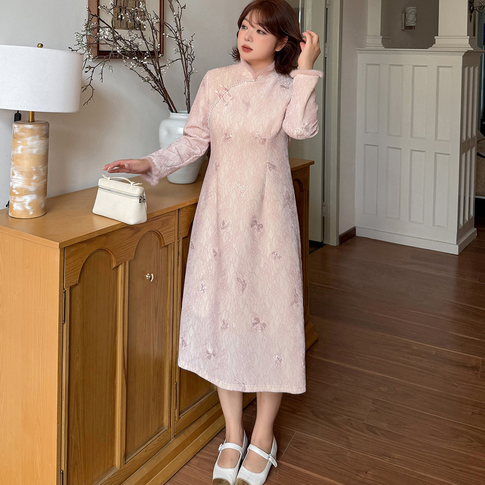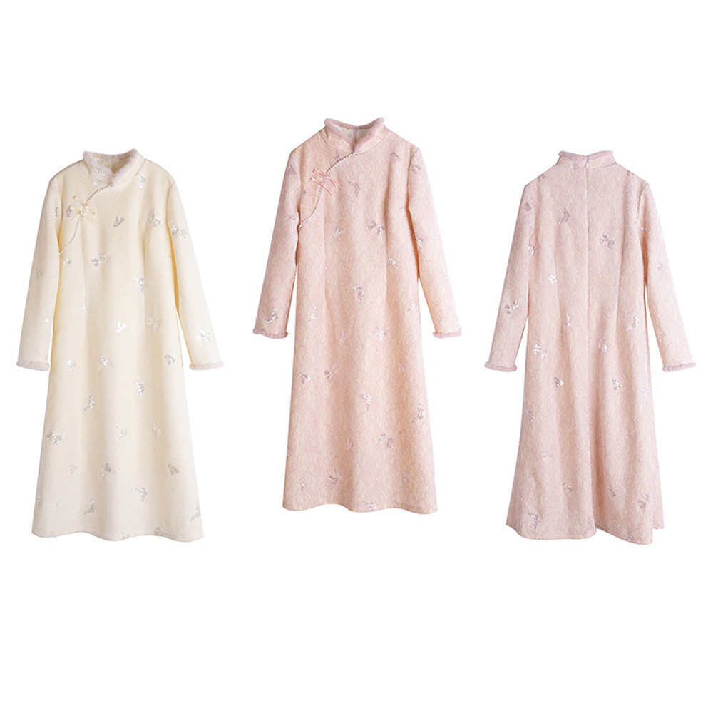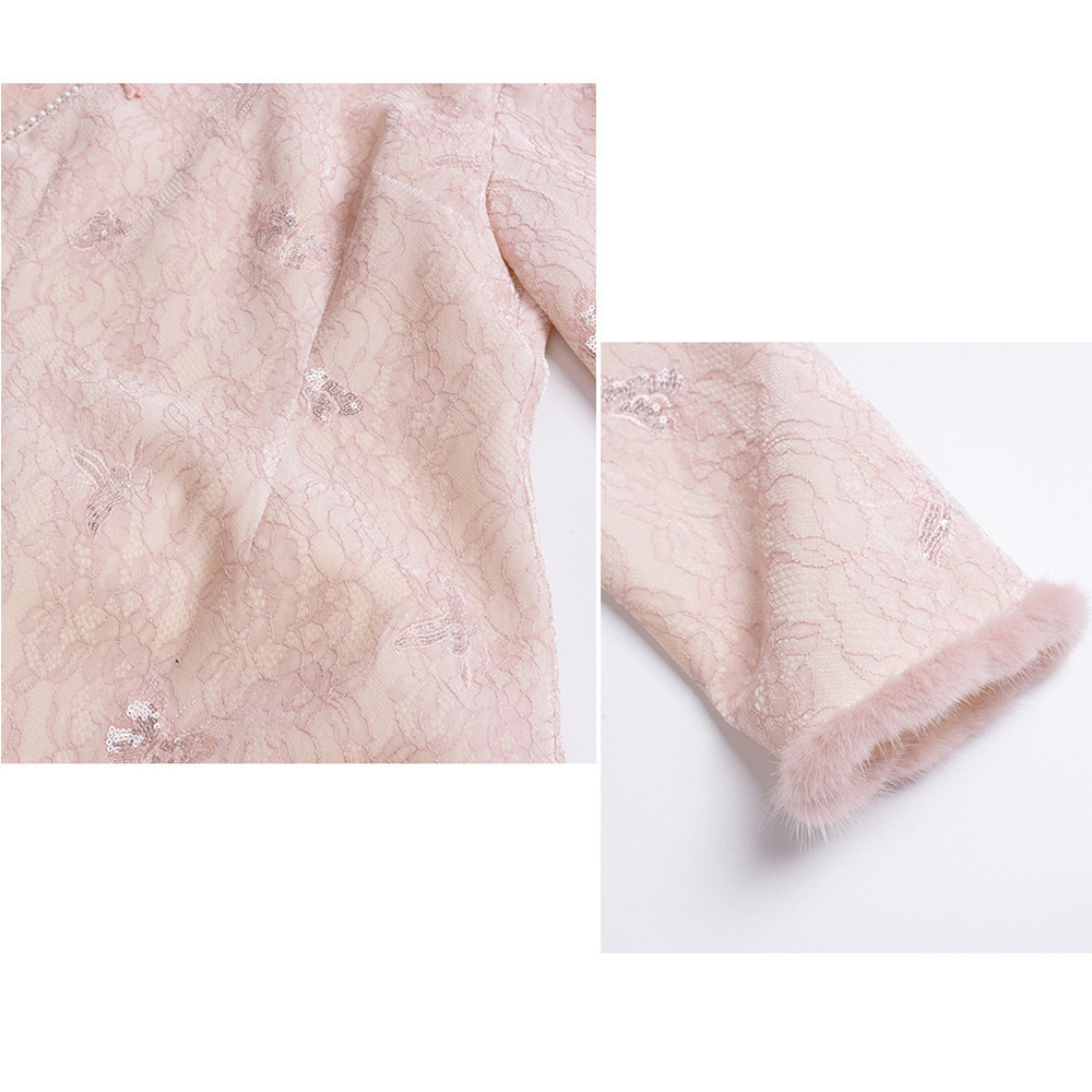 暖かなフリース裏地付き レース複合素材のチャイナ風ワンピース
