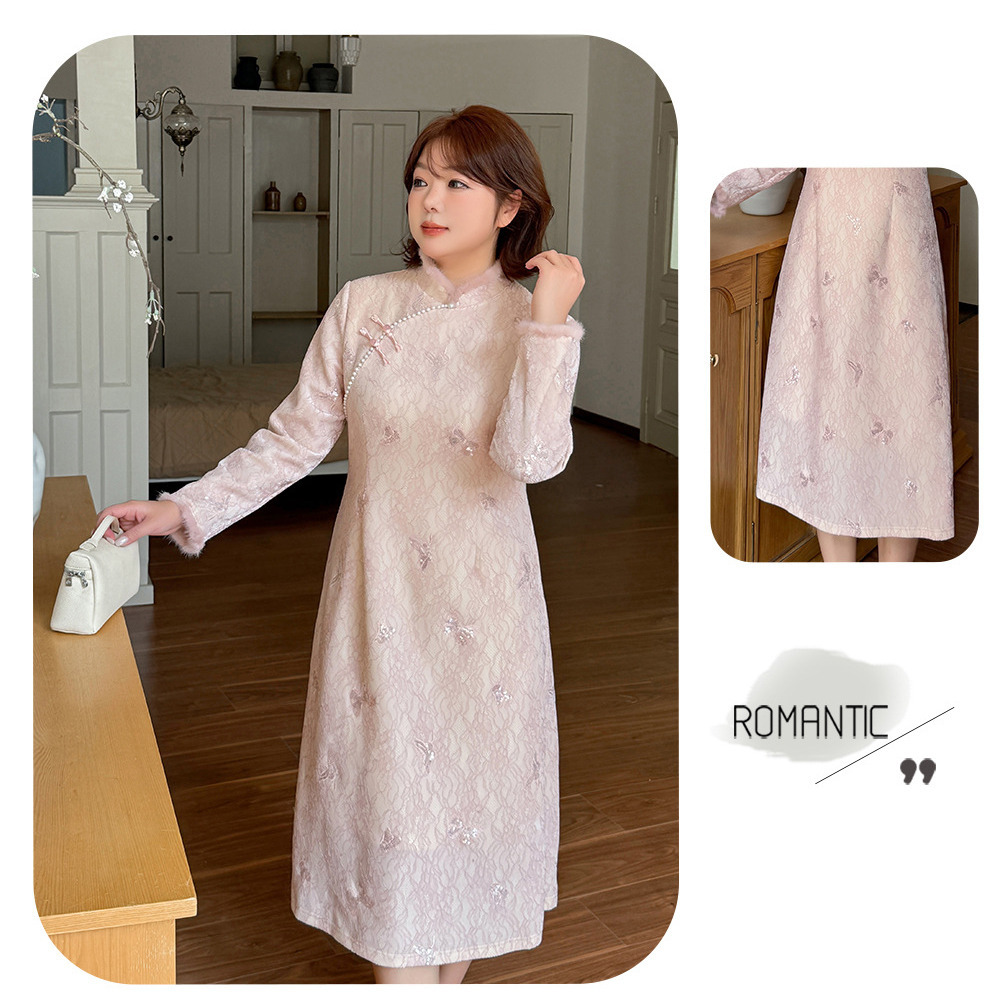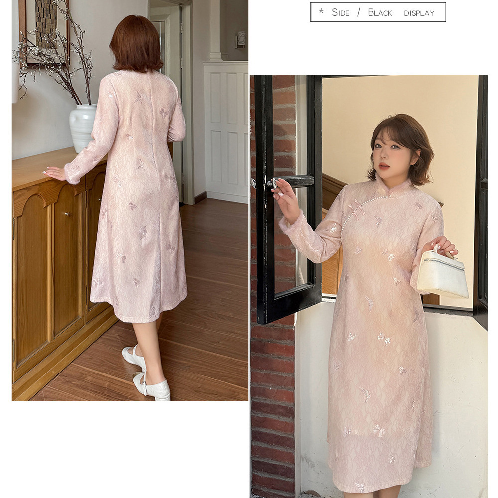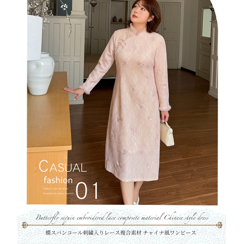 • 暖かなフリース裏地付き レース複合素材のチャイナ風ワンピース19