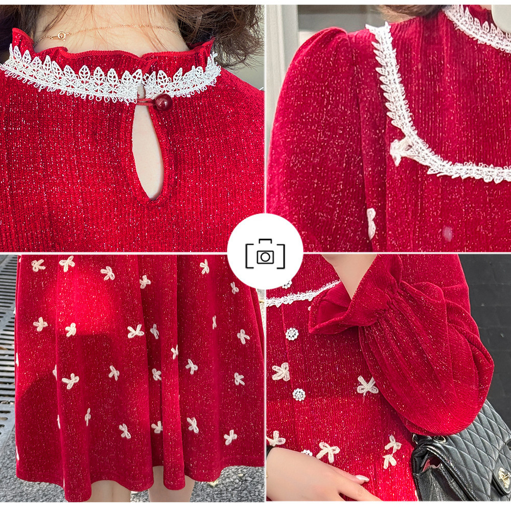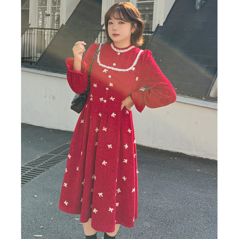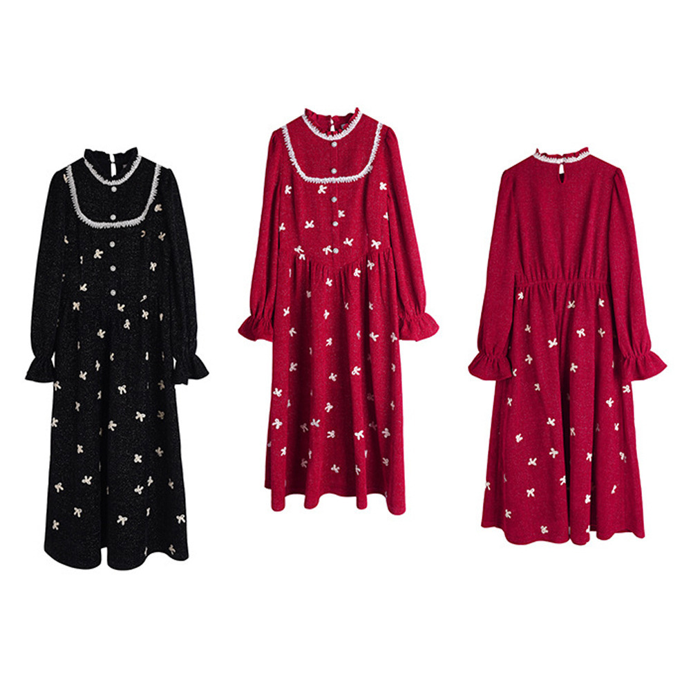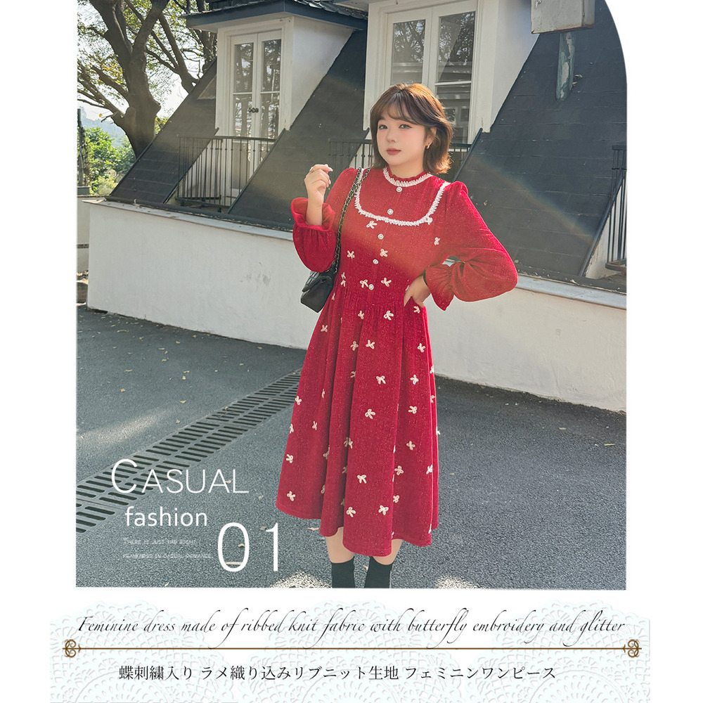 「蝶刺繍 ラメ織り込みニット生地ワンピース」