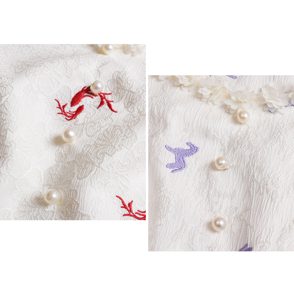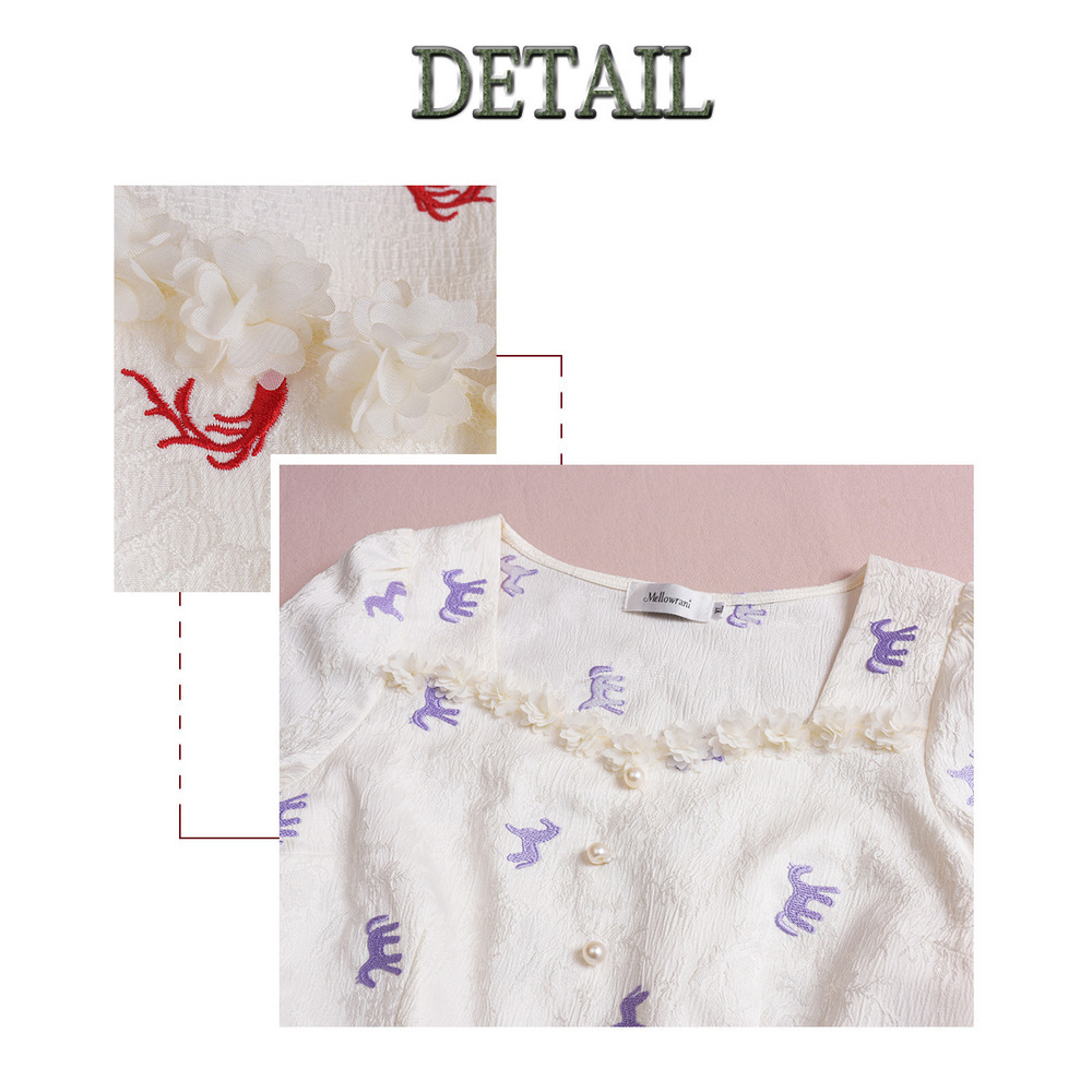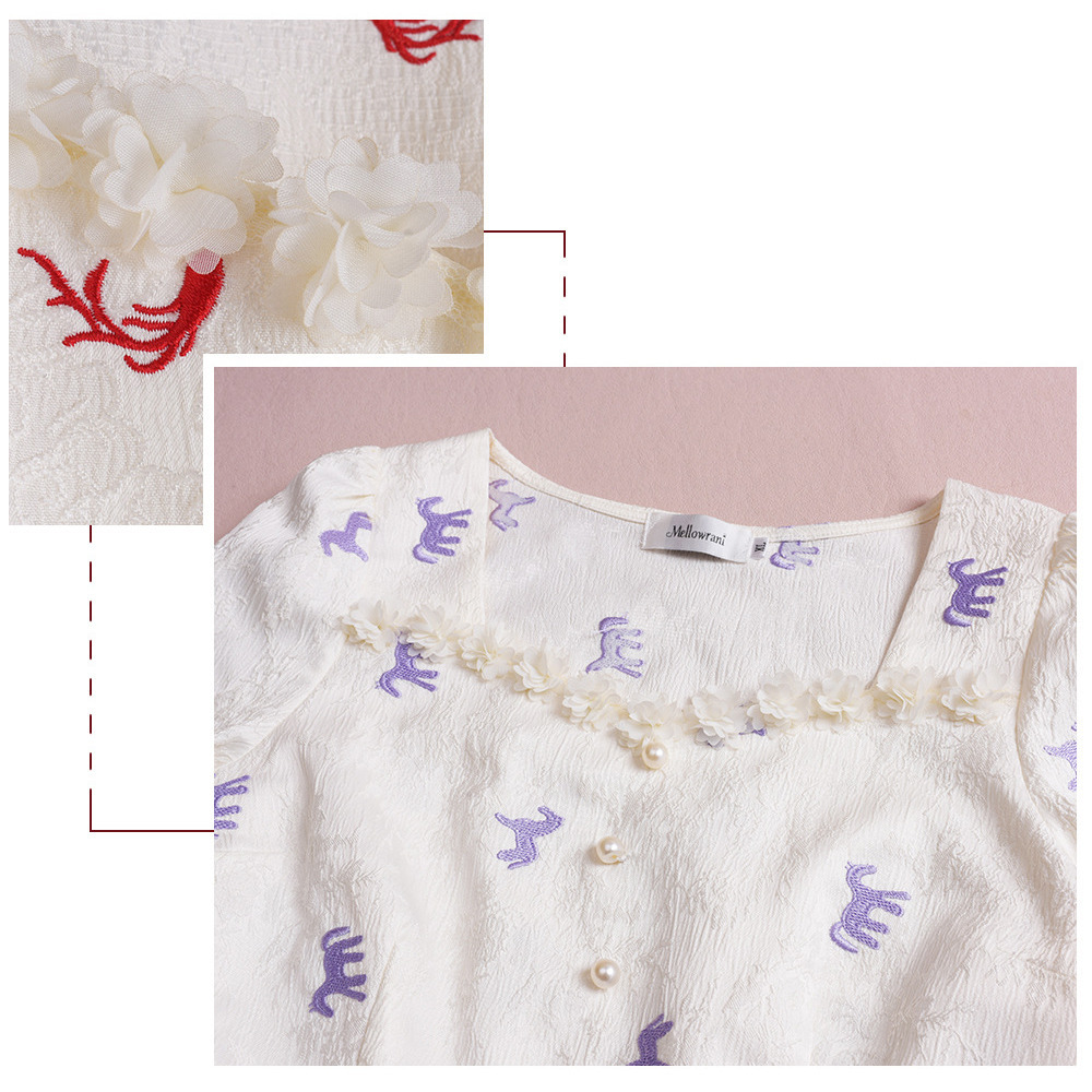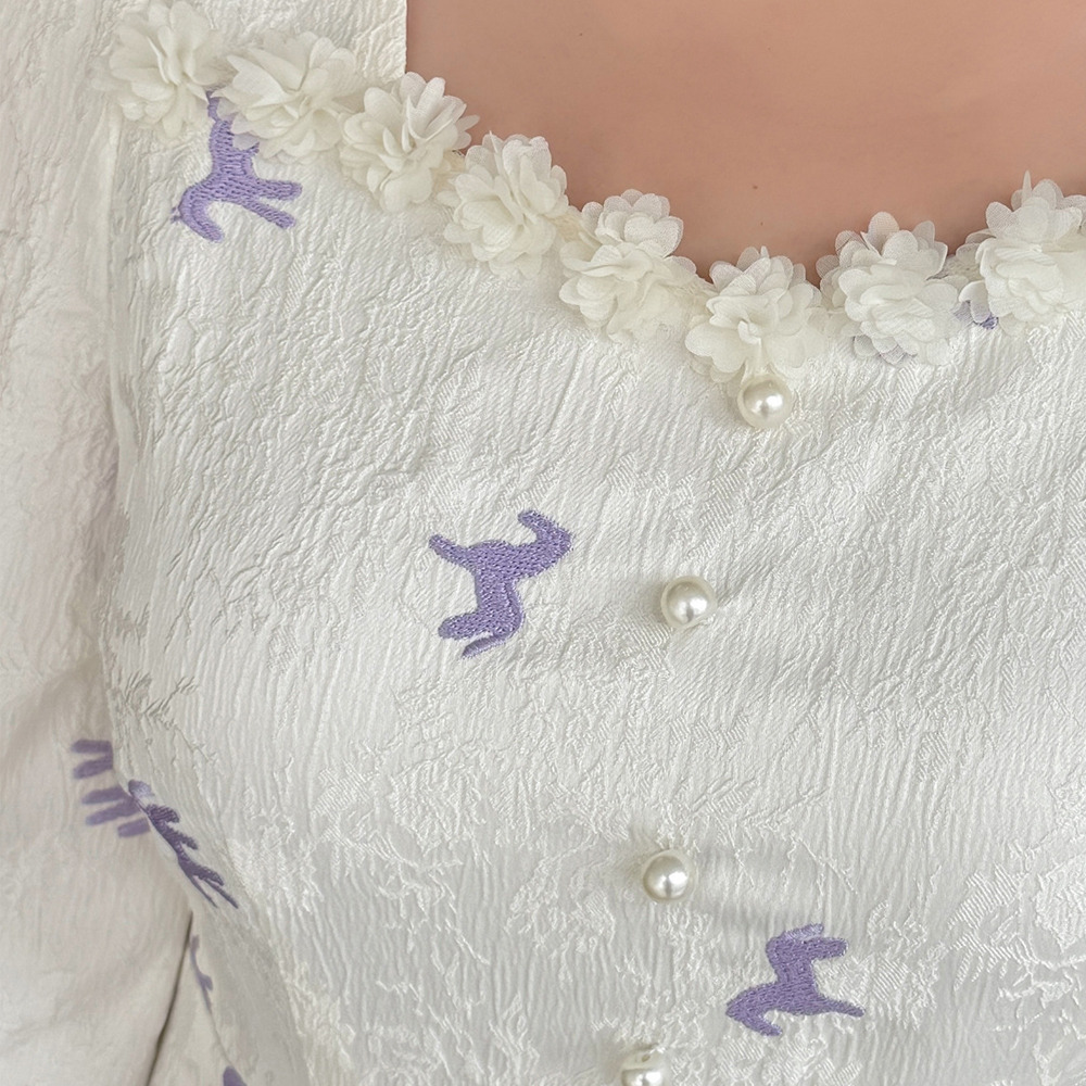 花のモチーフ飾りのついたスクエアネックでカフ付きのパフスリーブ。