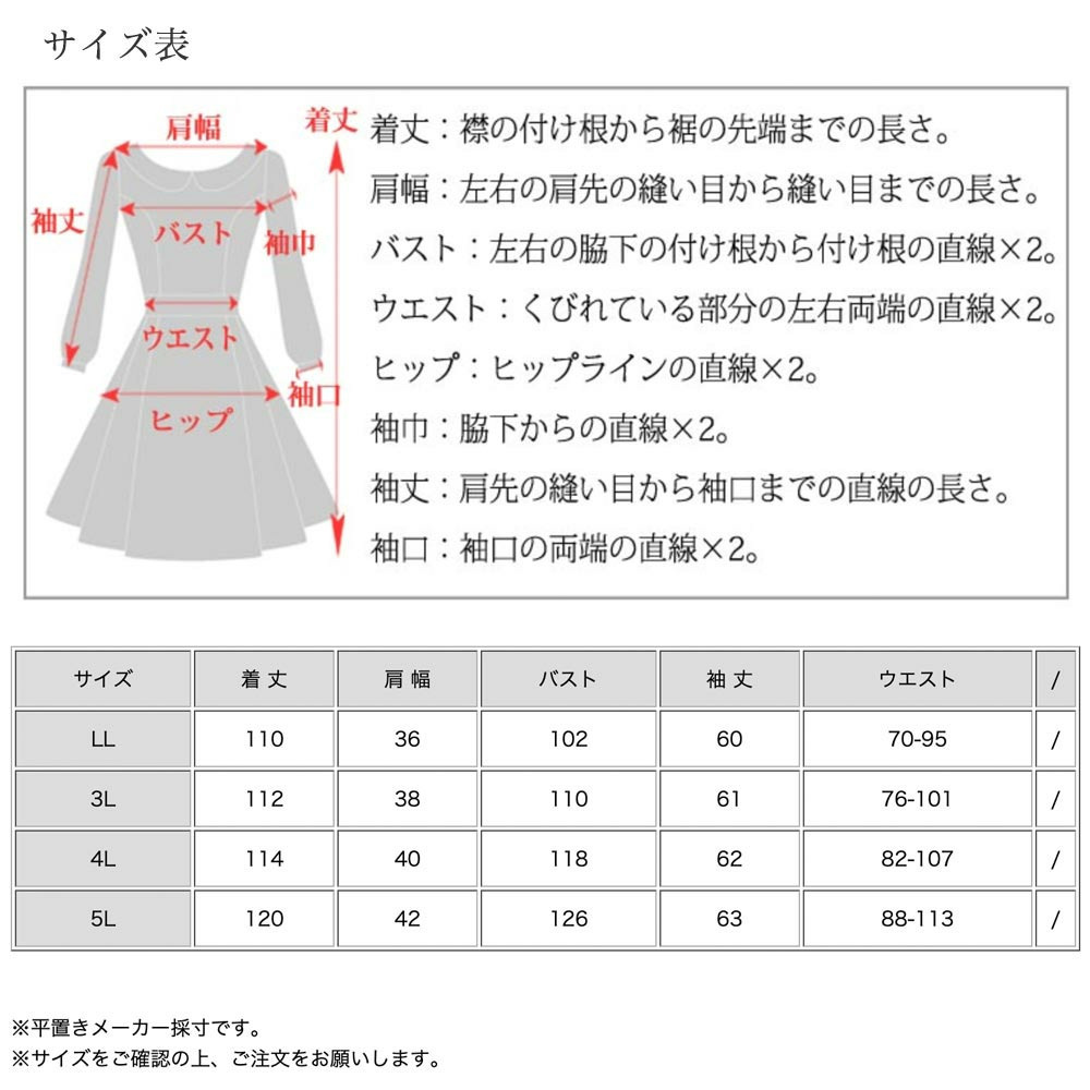 サイズ表記 LL 3L 4L 5L 着丈 110cm 112cm 114cm 116cm 肩幅 36cm 38cm 40cm 42cm バスト 102cm 110cm 118cm 126cm 袖丈 60cm 61cm 62cm 63cm ウエスト 70-95cm 76-101cm 82-107cm 88-113cm