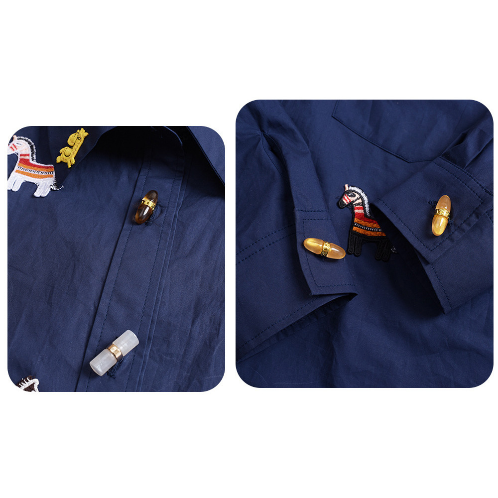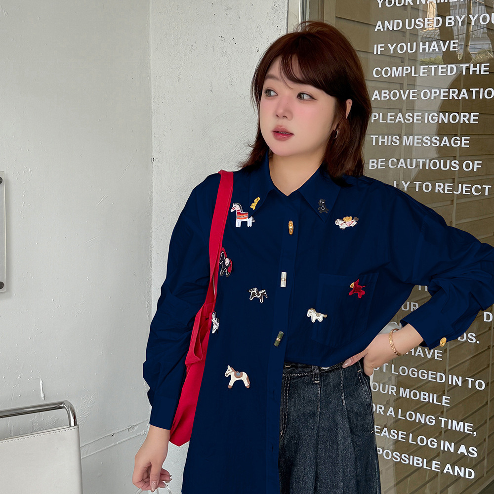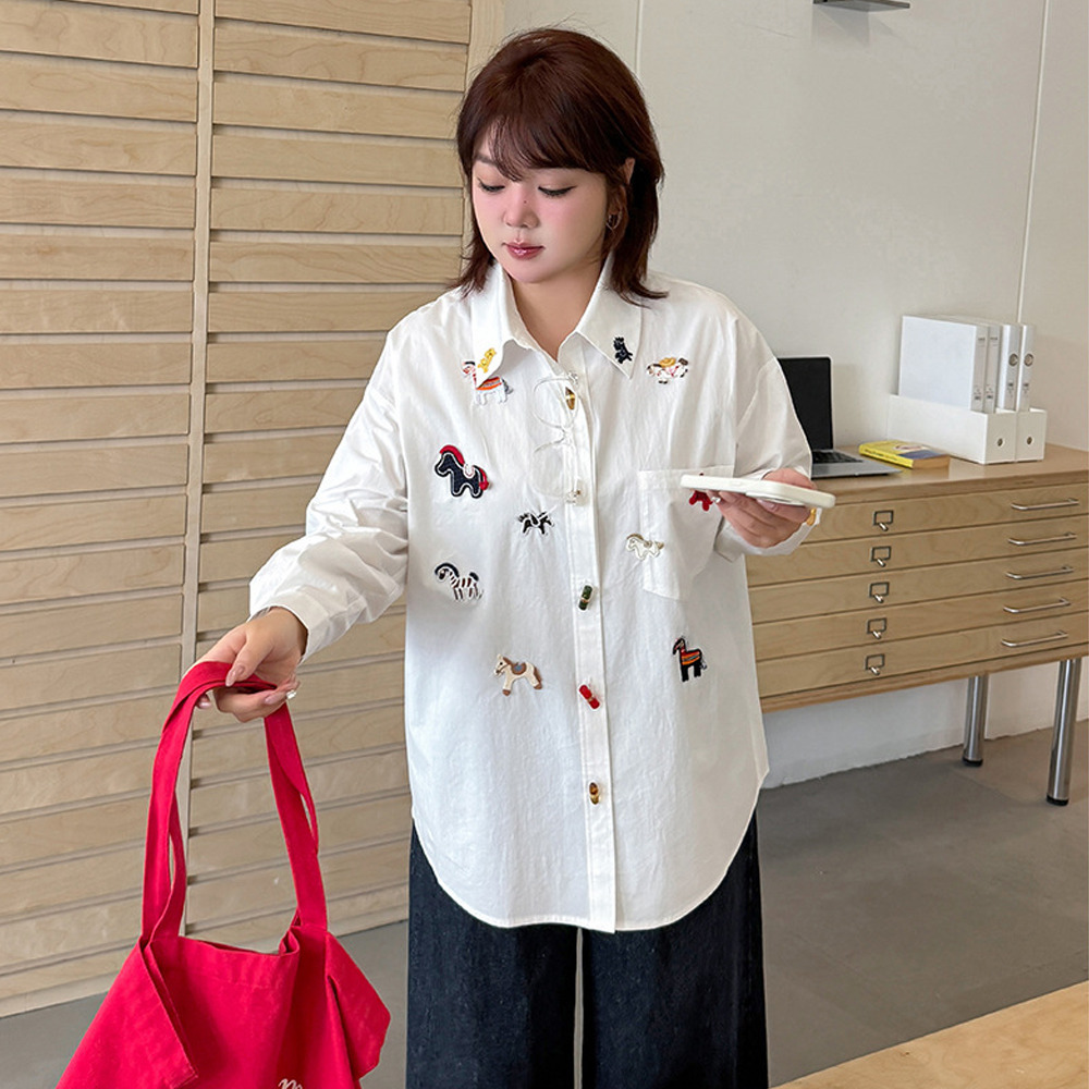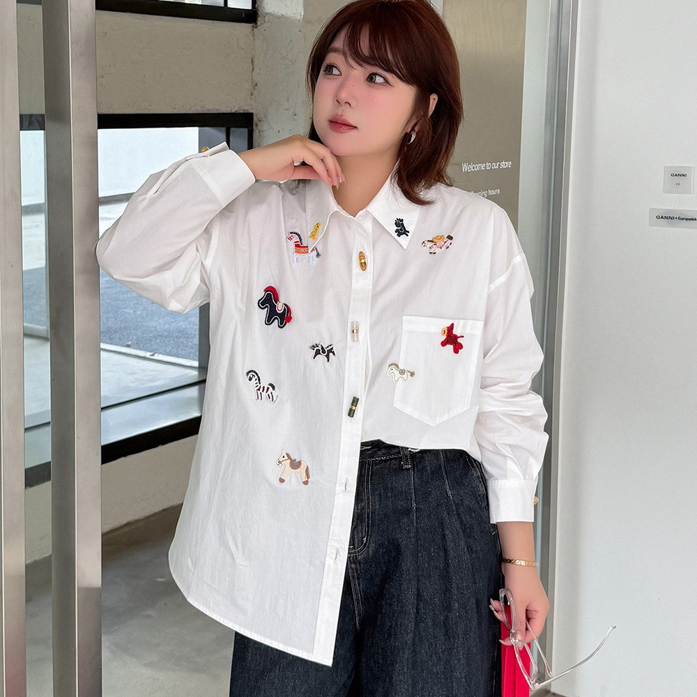 「ラッキホース刺繍入り 長袖シャツブラウス」