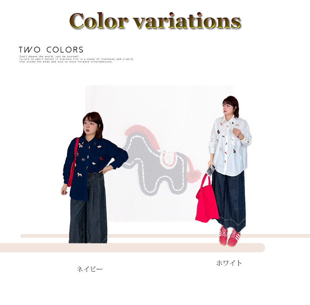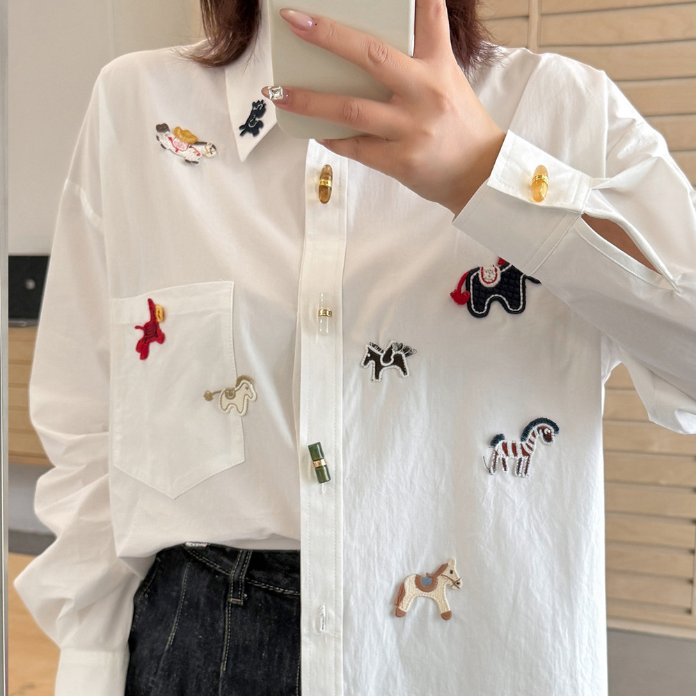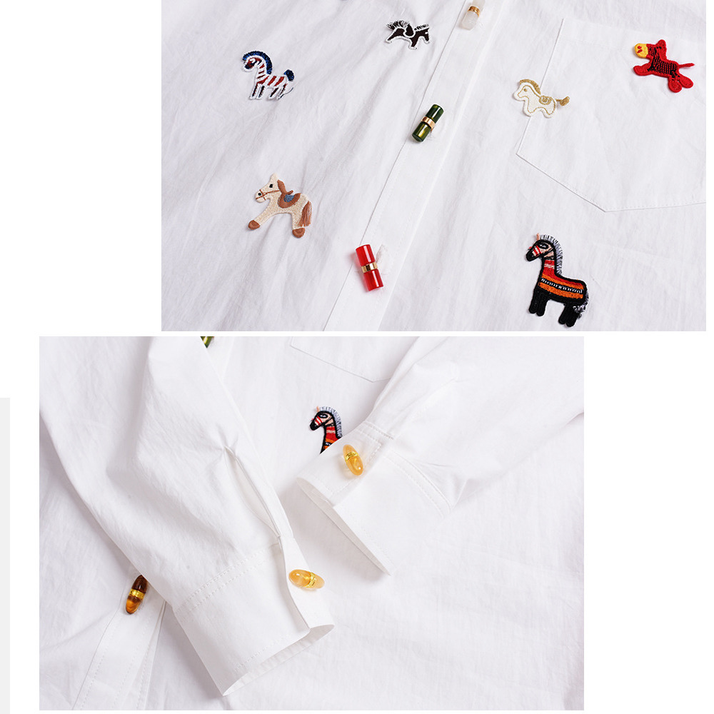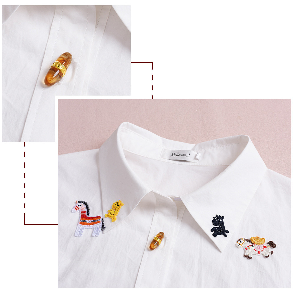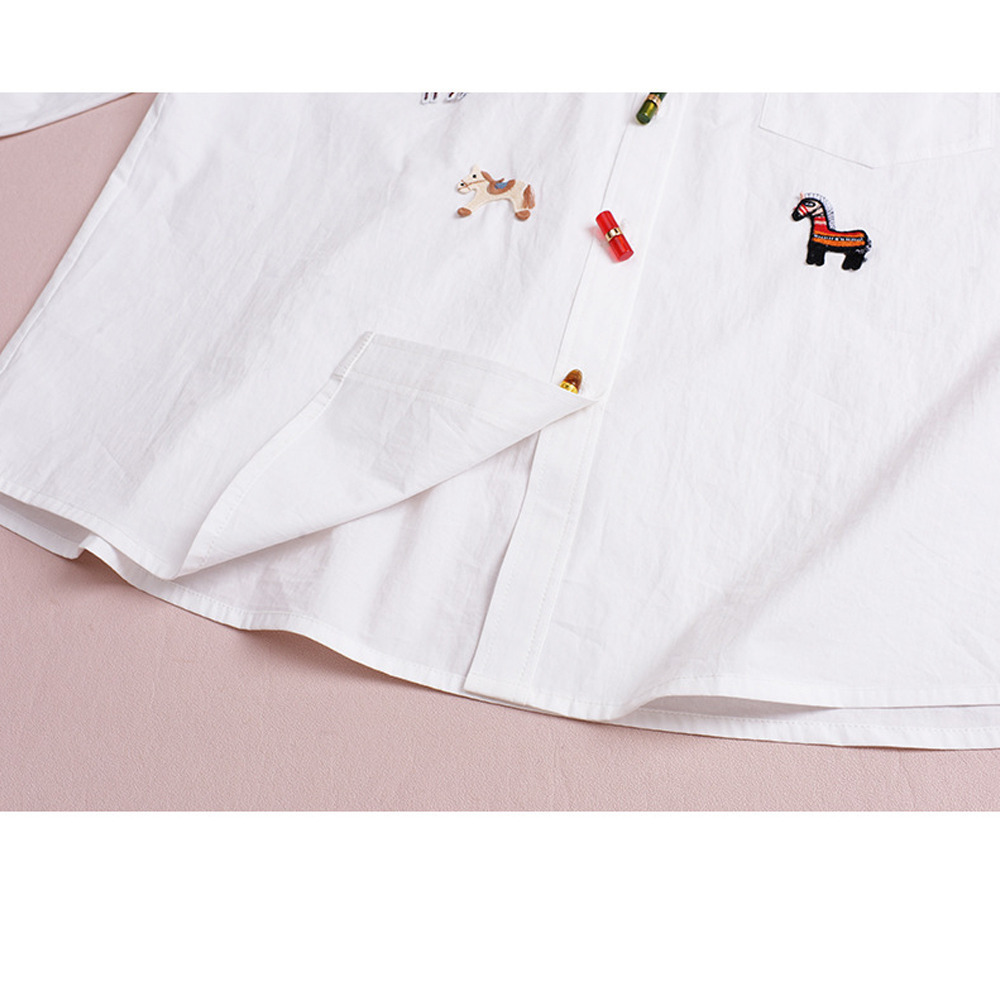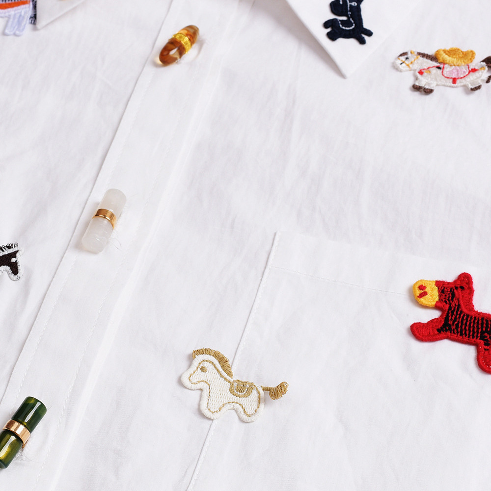 幸せを呼ぶラッキーホースの刺繍いりシャツブラウス。