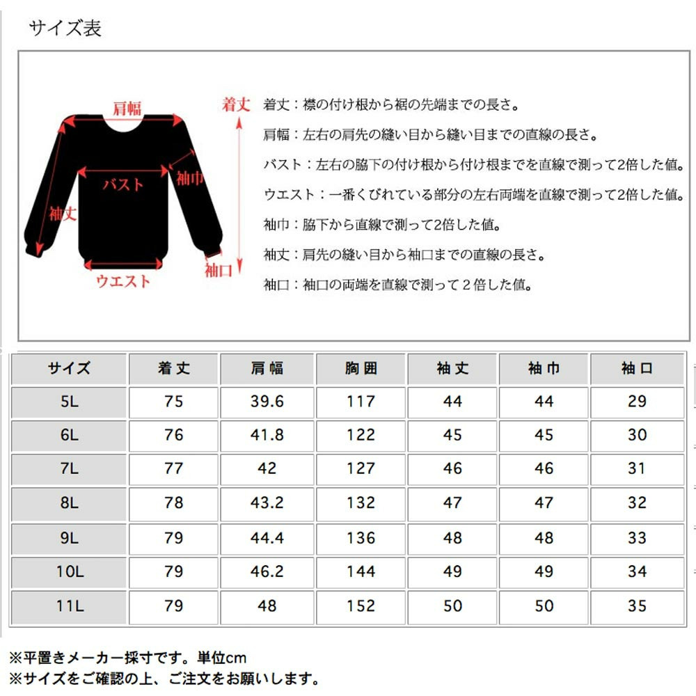 サイズ表記 5L 6L 7L 8L 9L 10L 11L 着丈 75cm 76cm 77cm 78cm 79cm 79cm 79cm 肩幅 39.6cm 41.8cm 42cm 43.2cm 44.4cm 46.2cm 48cm 胸囲 117cm 122cm 127cm 132cm 136cm 144cm 152cm 袖丈 44cm 45cm 46cm 47cm 48cm 49cm 50cm 袖巾 44cm 45cm 46cm 47cm 48cm 49cm 50cm 袖口 29cm 30cm 31cm 32cm 33cm 34cm 35cm