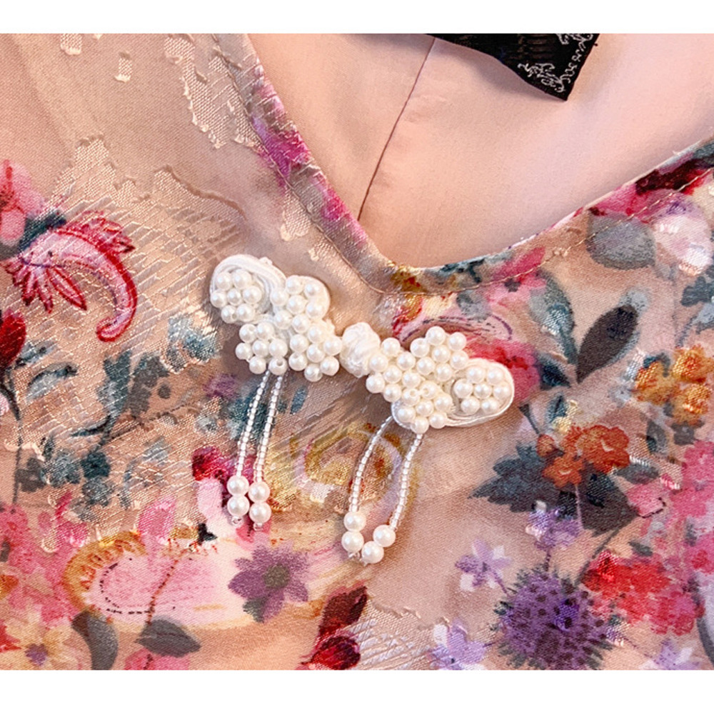 Vネックでネック下にパールビーズのバックル風飾り付き。