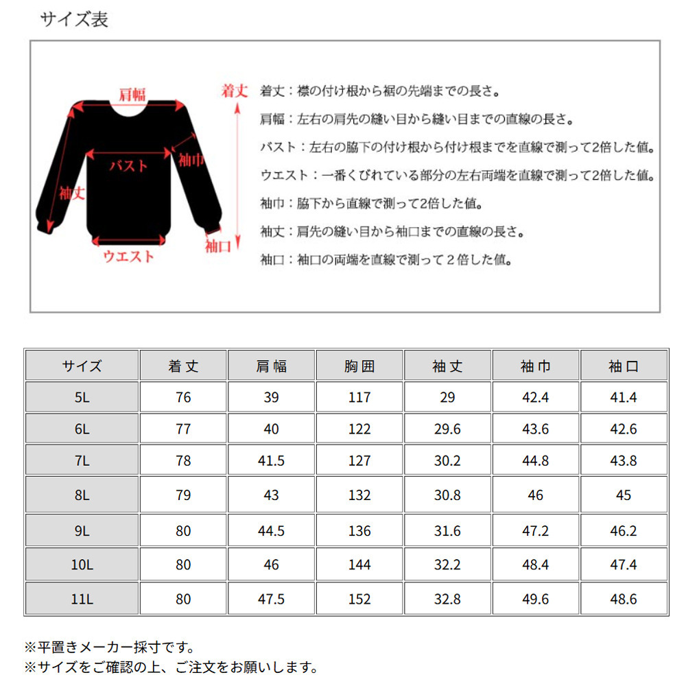サイズ表記 5L 6L 7L 8L 9L 10L 11L 着丈 76cm 77cm 78cm 79cm 80cm 80cm 80cm 肩幅 39cm 40cm 41.5cm 43cm 44.5cm 46cm 47.5cm 胸囲 117cm 122cm 127cm 132cm 136cm 144cm 152cm 袖丈 29cm 29.6cm 30.2cm 30.8cm 31.6cm 32.2cm 32.8cm 袖巾 42.4cm 43.6cm 44.8cm 46cm 47.2cm 48.4cm 49.6cm 袖口 41.4cm 42.6cm 43.8cm 45cm 46.2cm 47.4cm 48.6cm