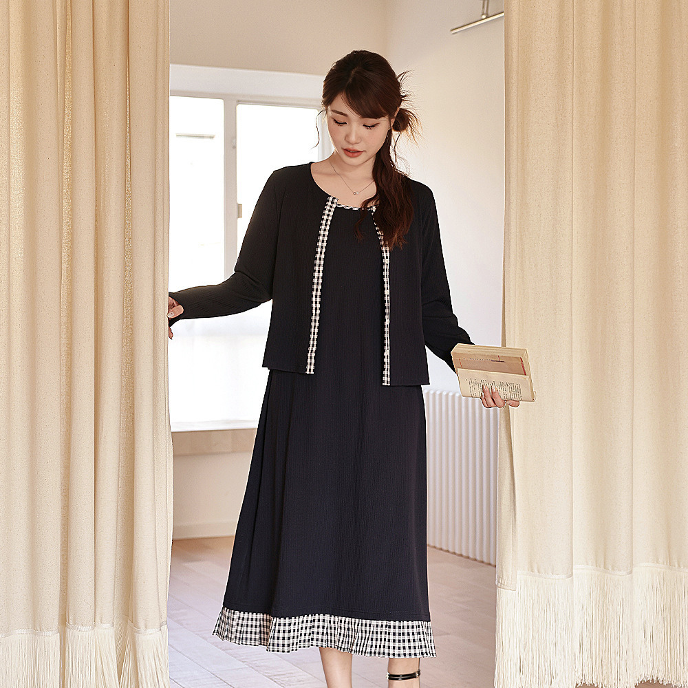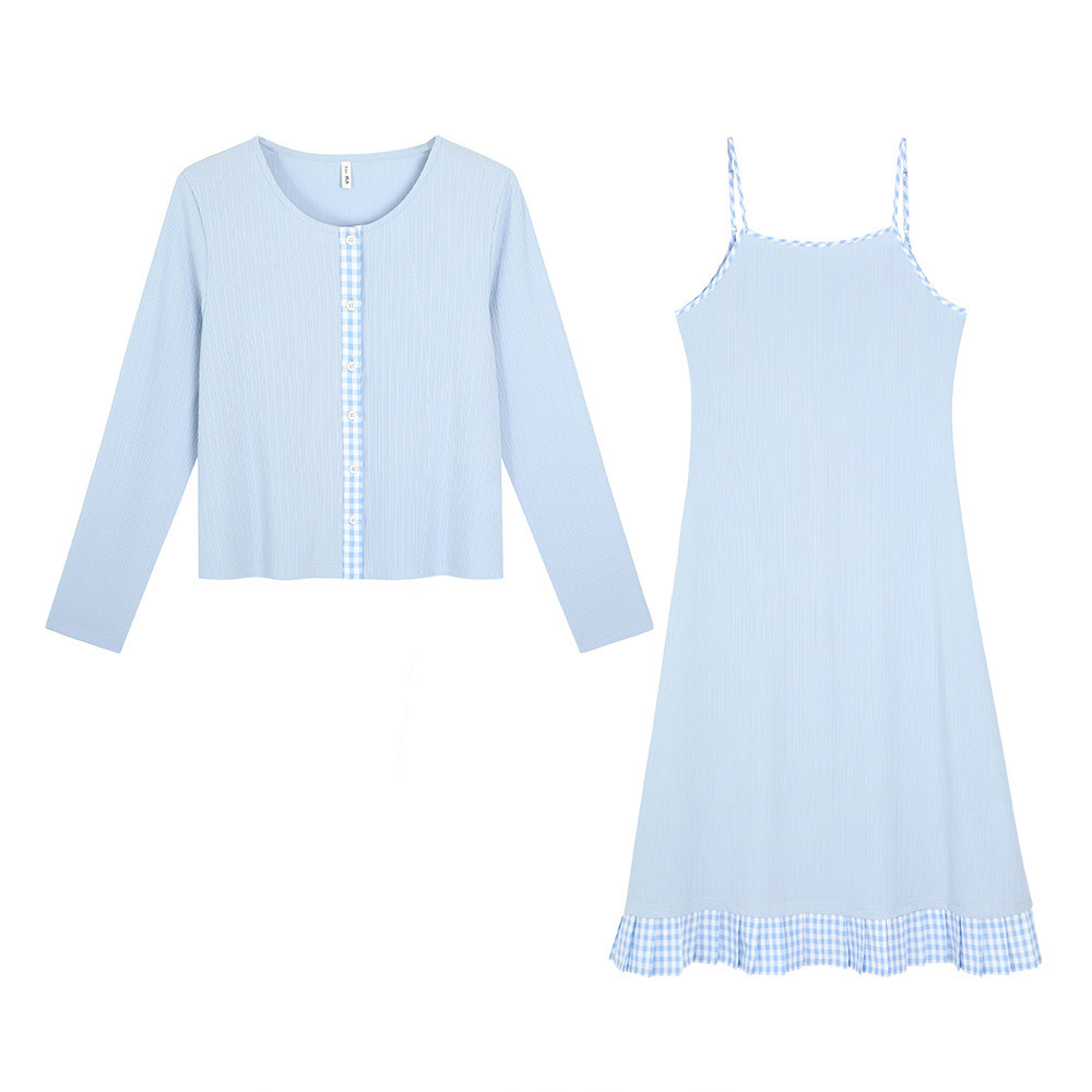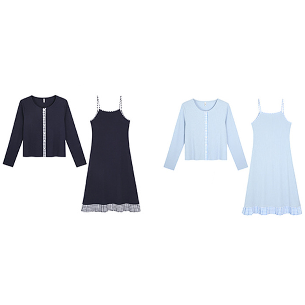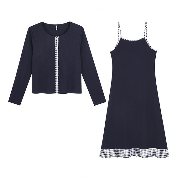 • チェックトリムの肩紐ワンピースとカーディガンのセットアップ1