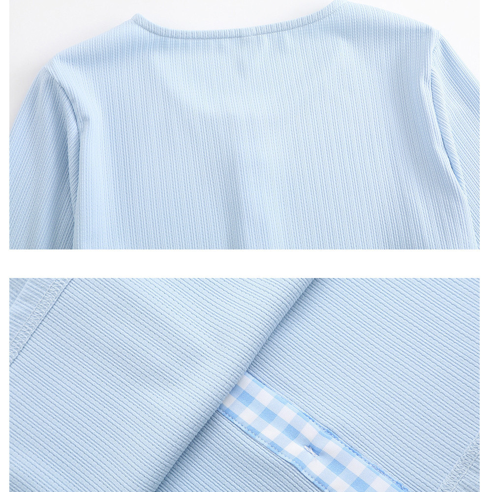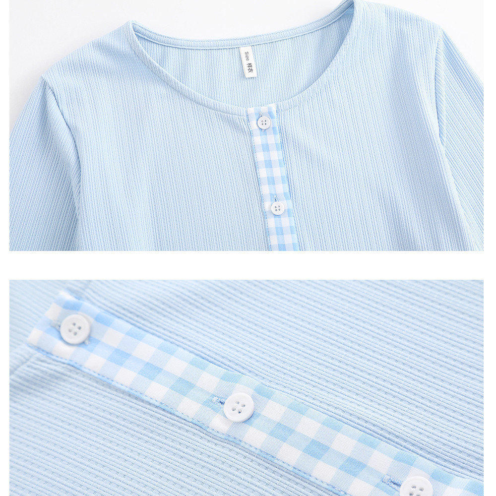 カーディガンはラウンドネックで前たてがギンガムチェック。