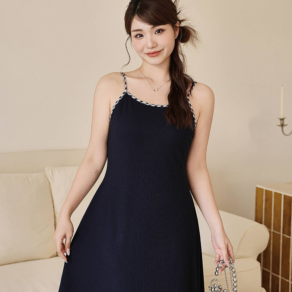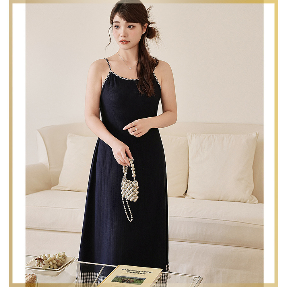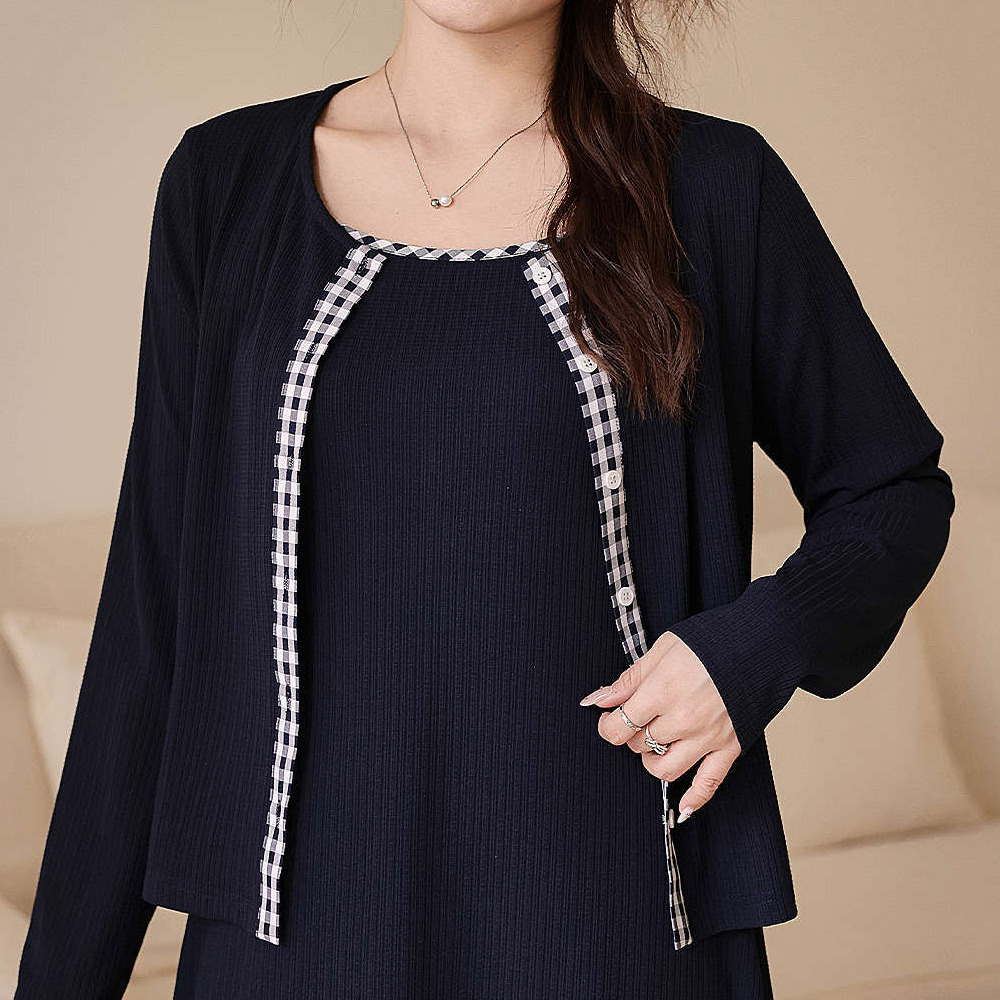 チェックトリムの肩紐ワンピースとカーディガンのセットアップ