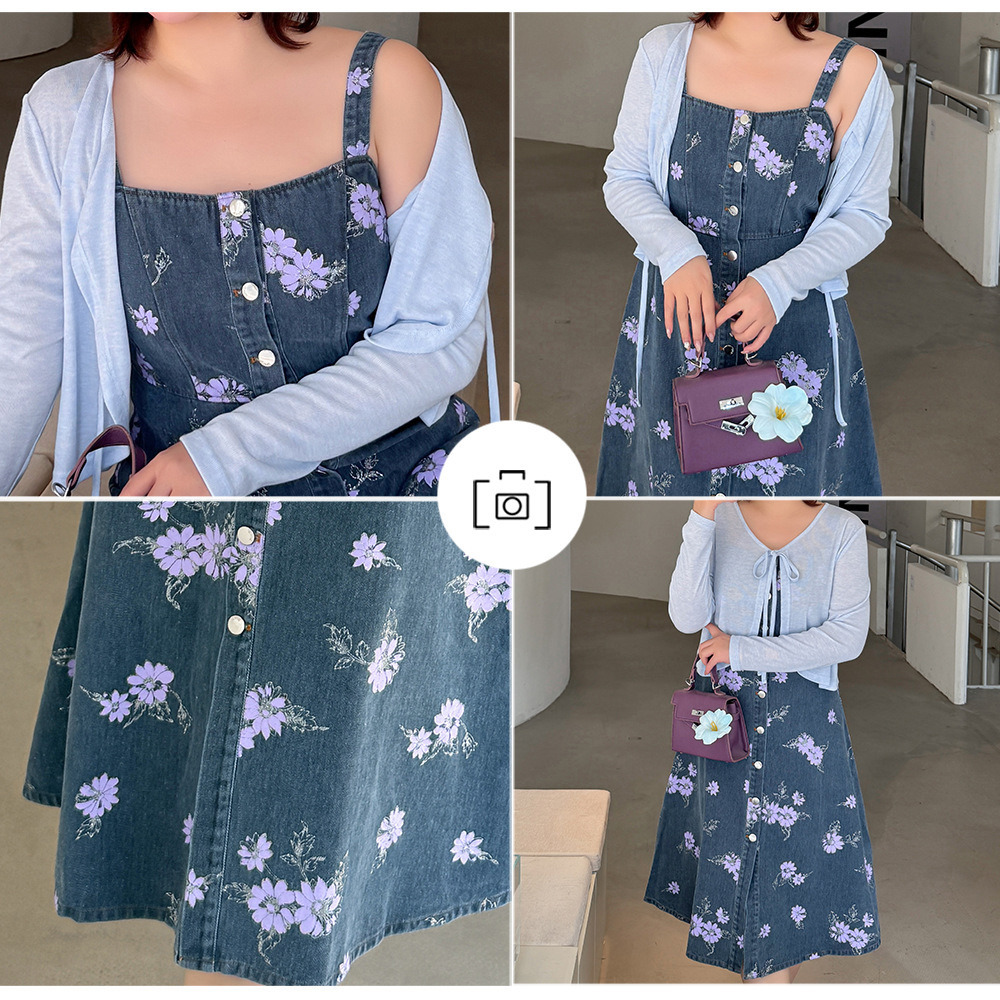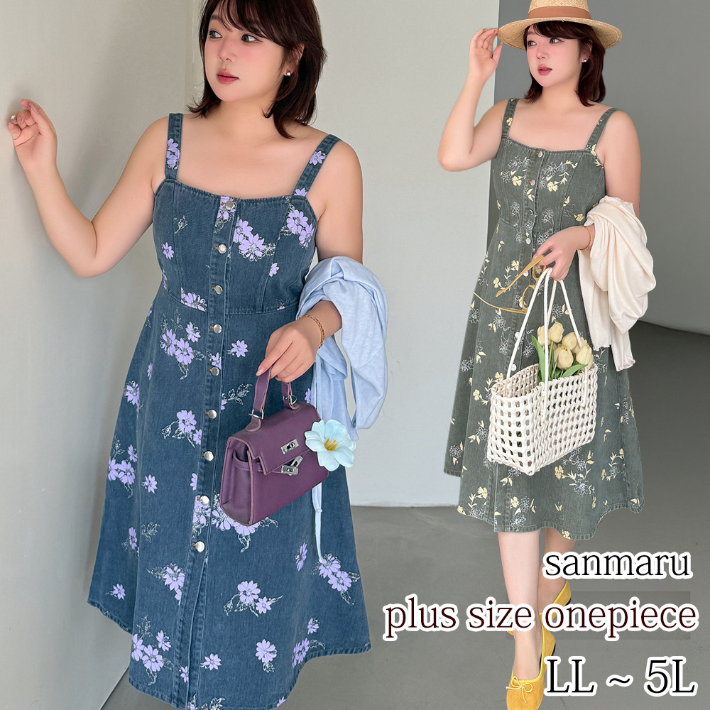 • ウォッシュ加工デニムにフラワープリントのサスペンダーワンピース sanmaru20