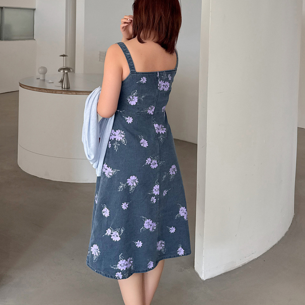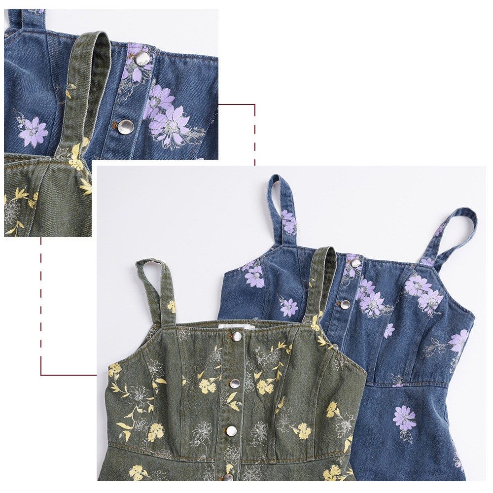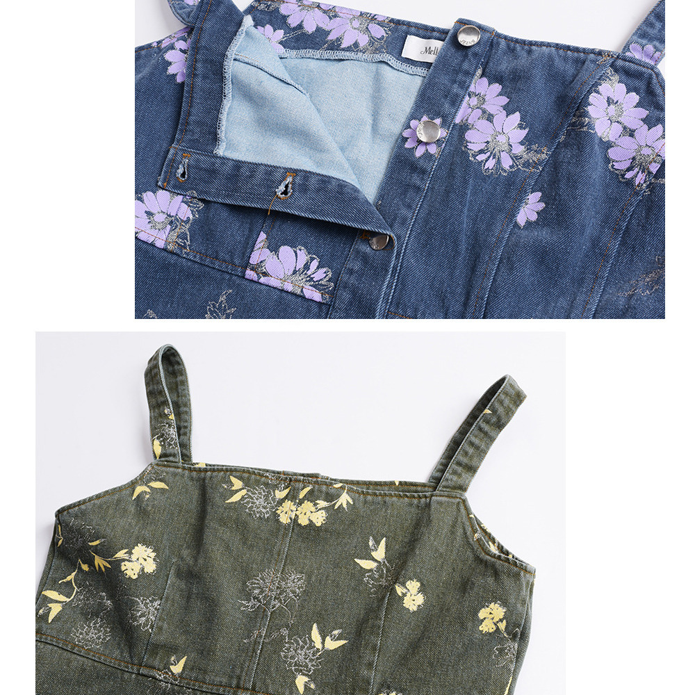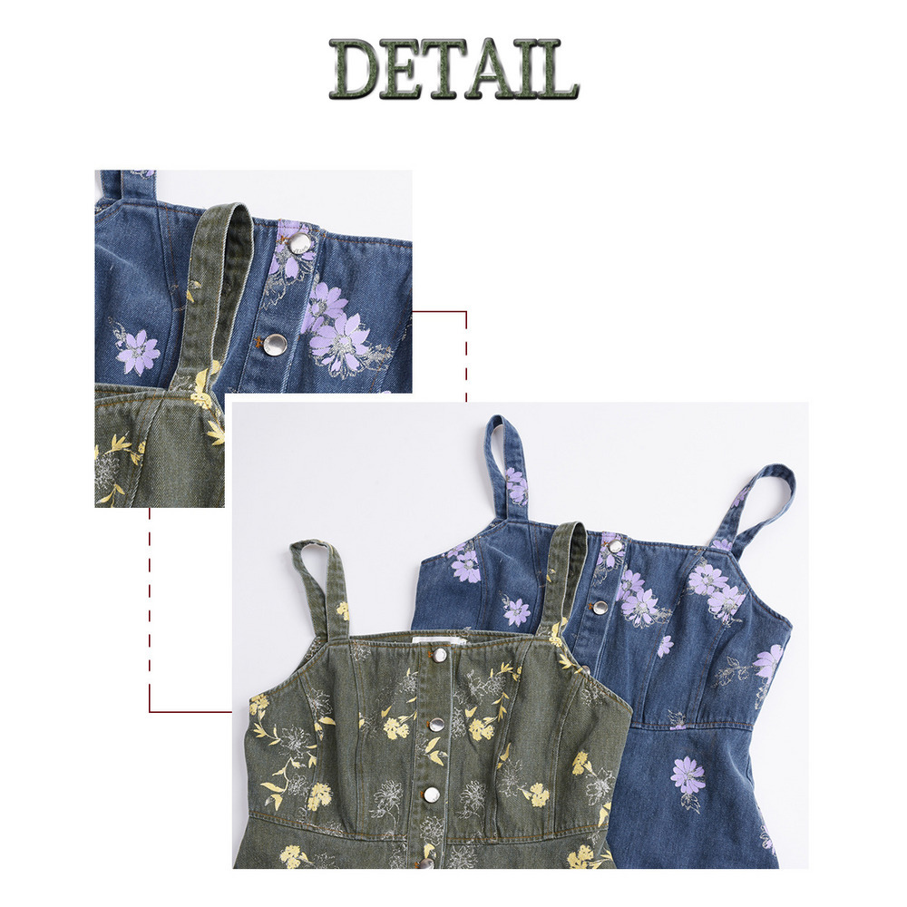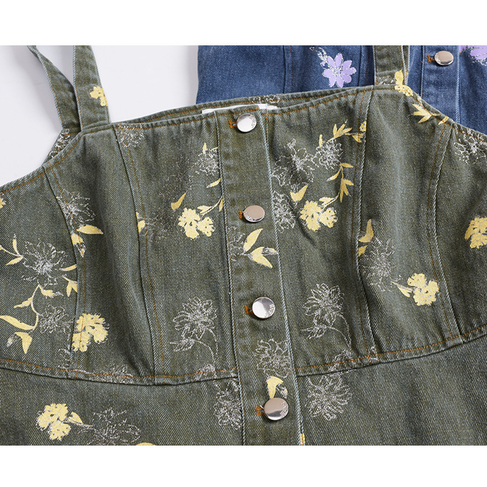 レトロなフラワープリントデニムの肩紐ワンピース。
