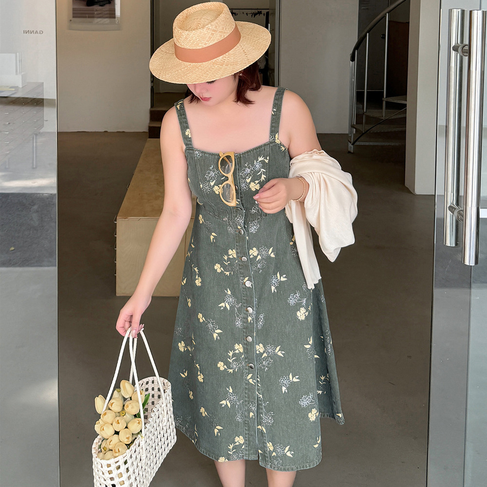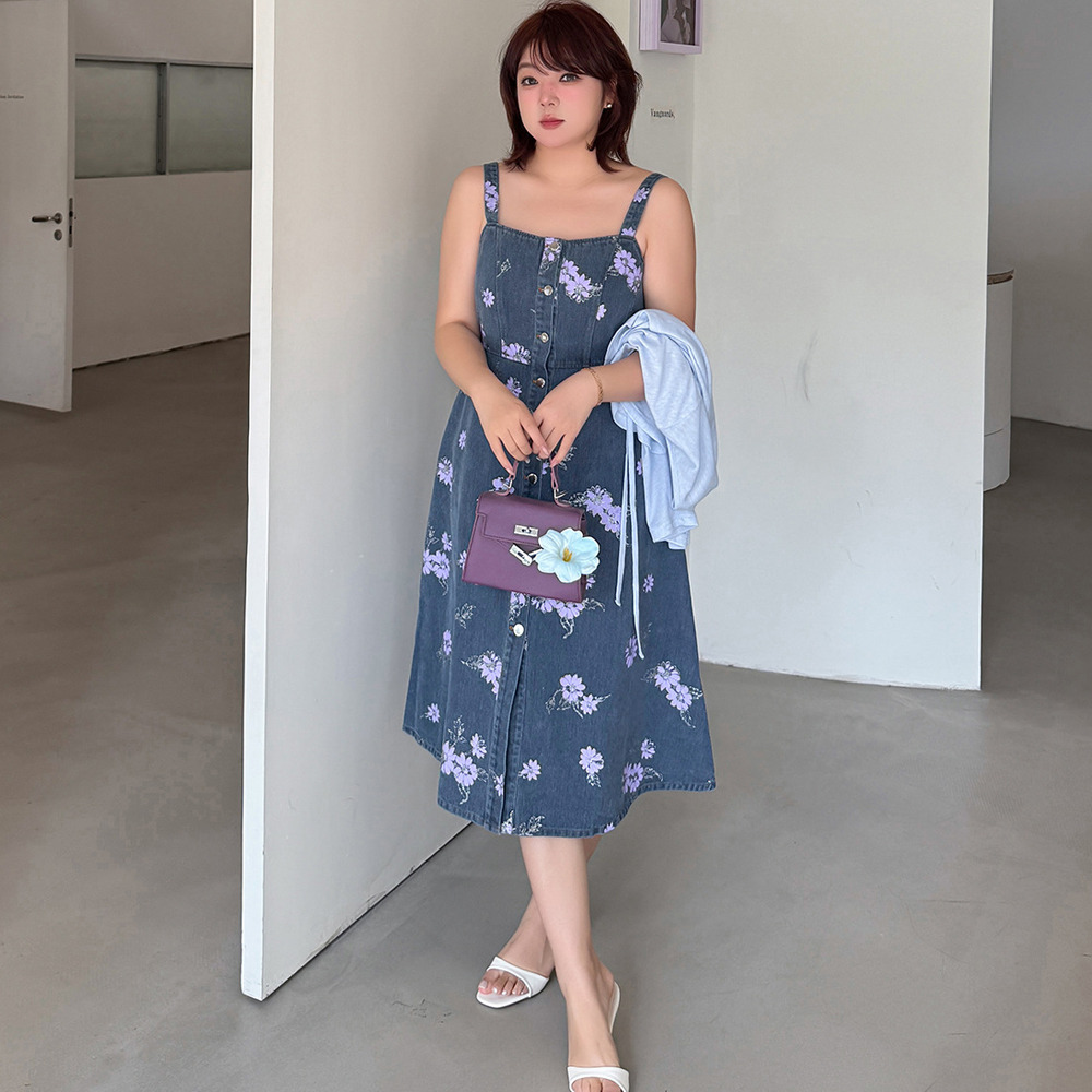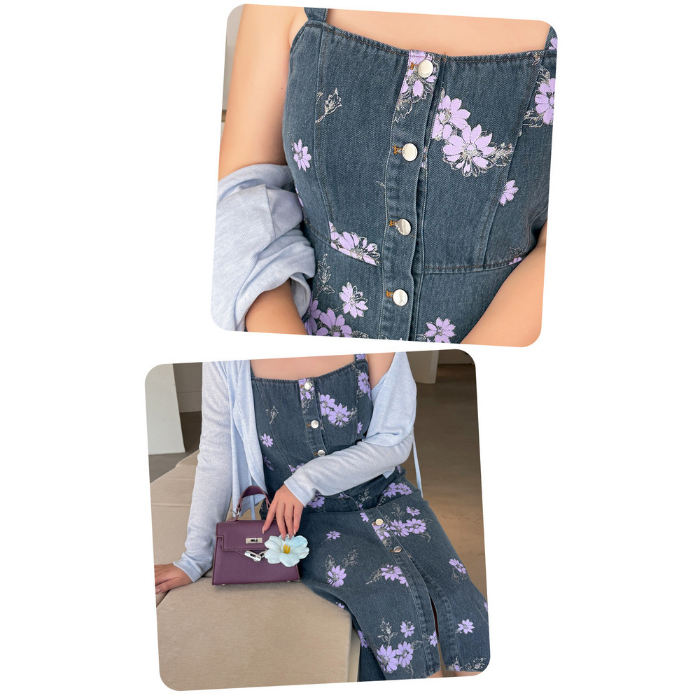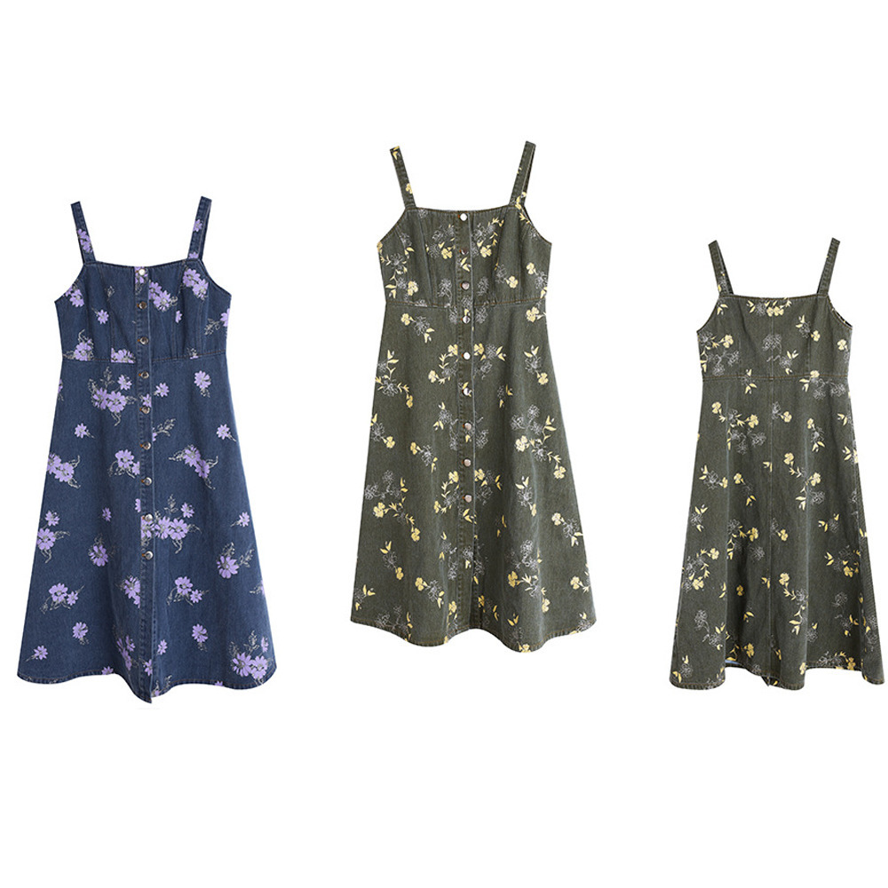 レトロなフラワープリントデニムの肩紐ワンピース。