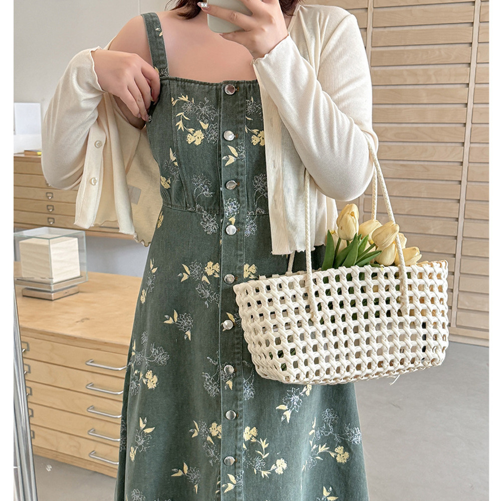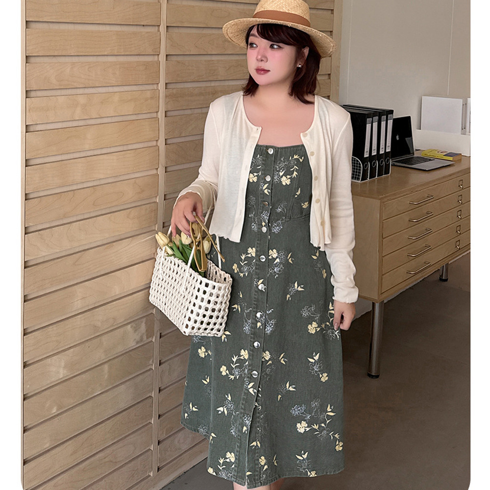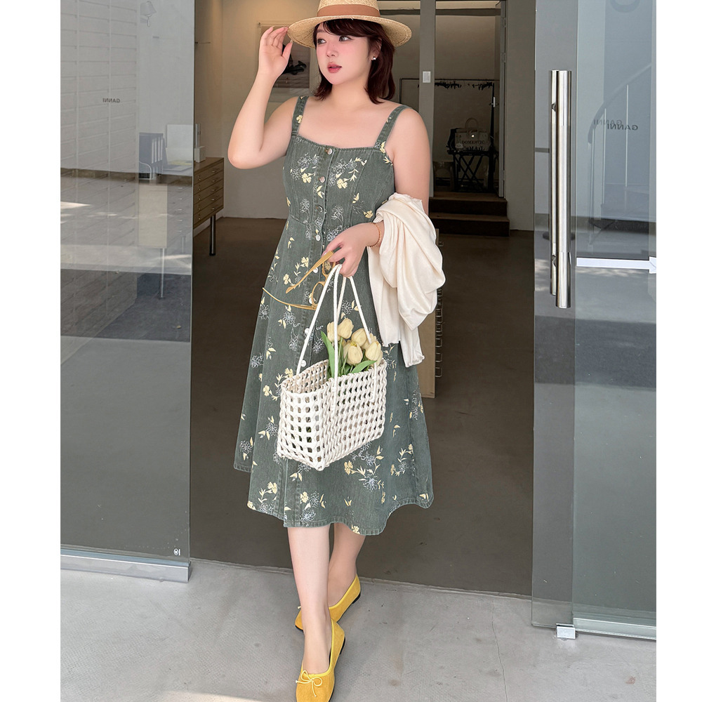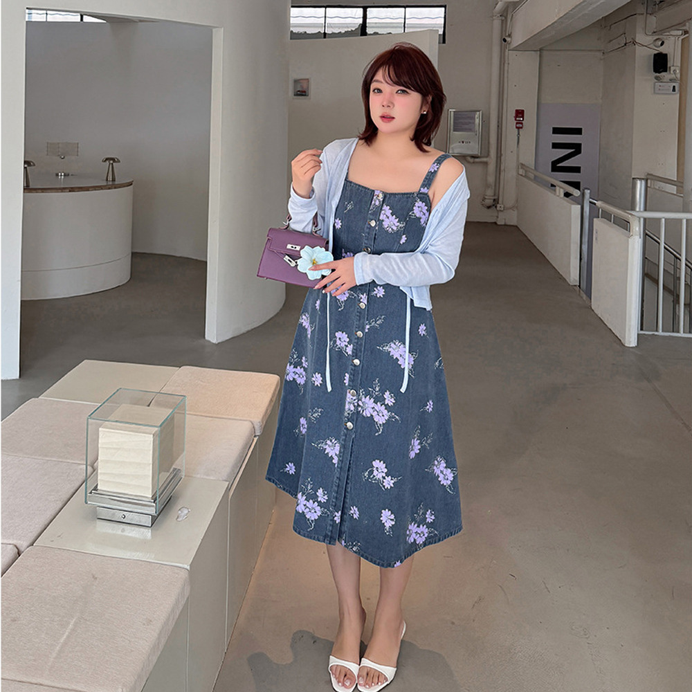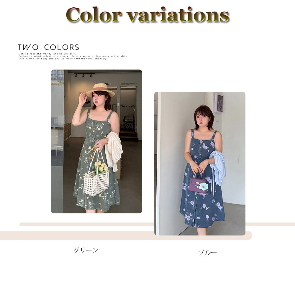 レトロなフラワープリントデニムの肩紐ワンピース。