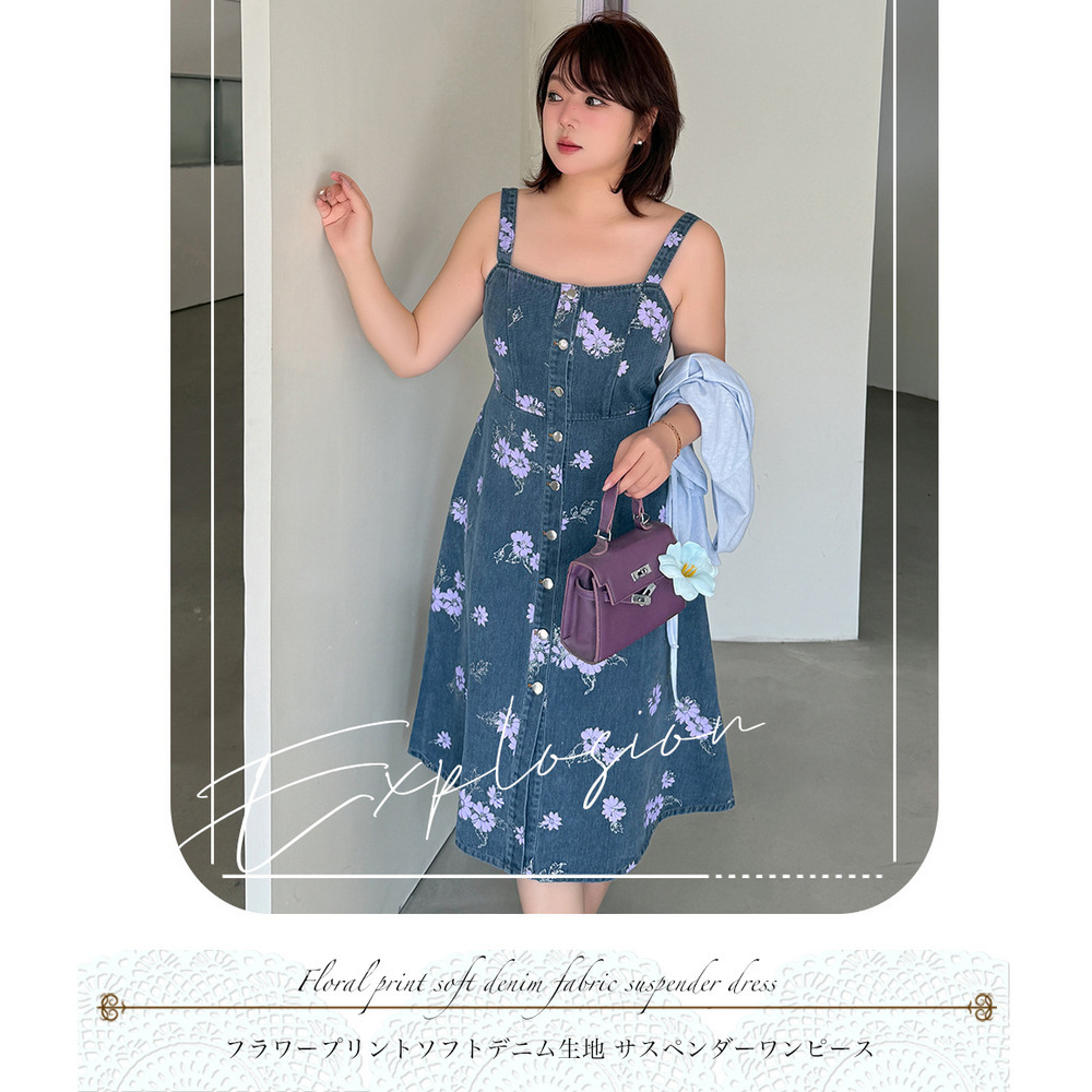 • ウォッシュ加工デニムにフラワープリントのサスペンダーワンピース sanmaru21