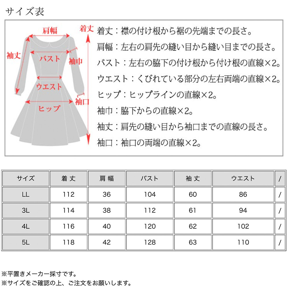 サイズ表記 LL 3L 4L 5L 着丈 112cm 114cm 116cm 118cm 肩幅 36cm 38cm 40cm 42cm バスト 104cm 112cm 120cm 128cm 袖丈 60cm 61cm 62cm 63cm ウエスト 86cm 94cm 102cm 110cm