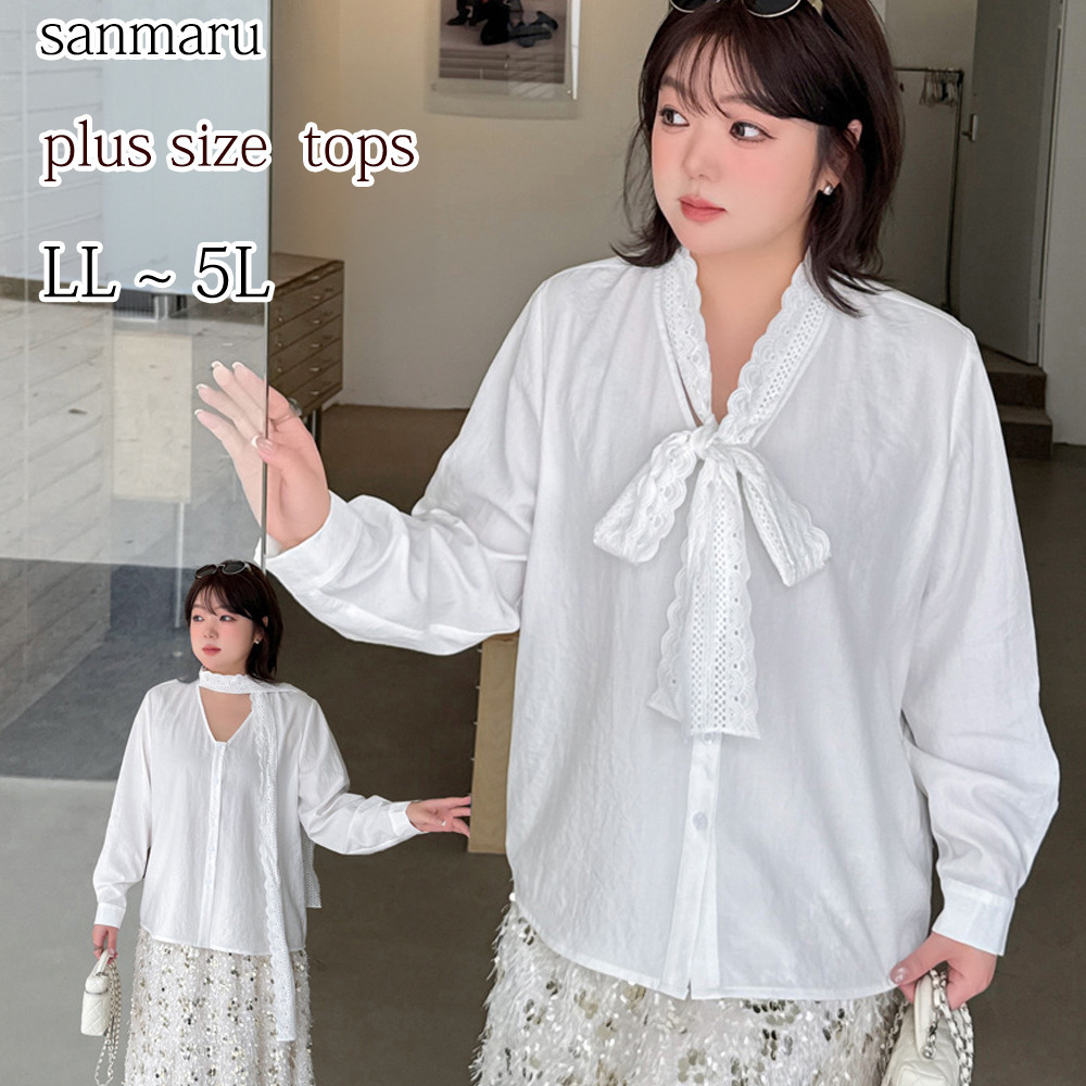 • レースリボンタイ付きVネック ホワイトシャツブラウス sanmaru13