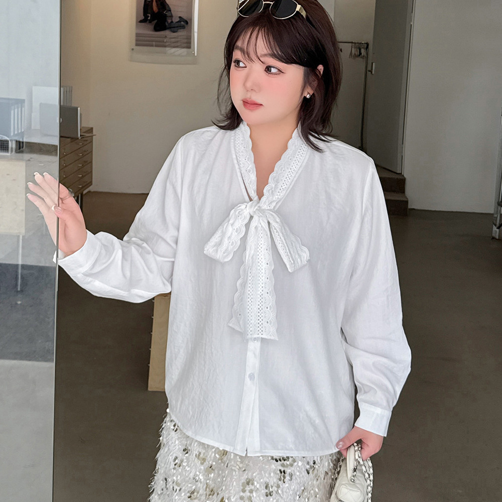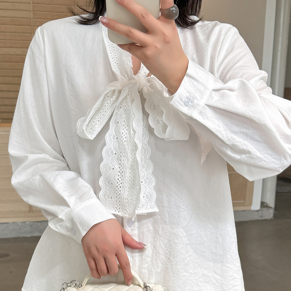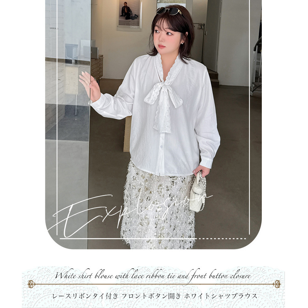 • レースリボンタイ付きVネック ホワイトシャツブラウス sanmaru11
