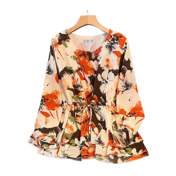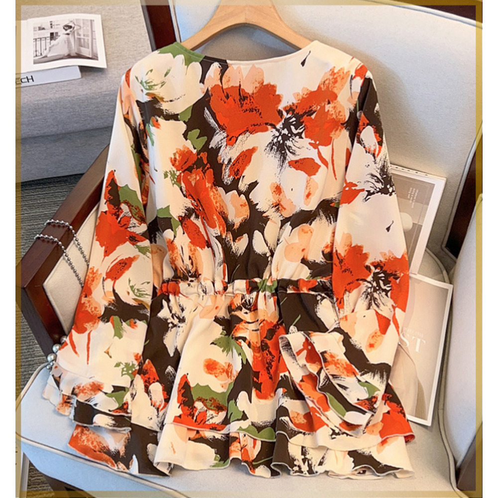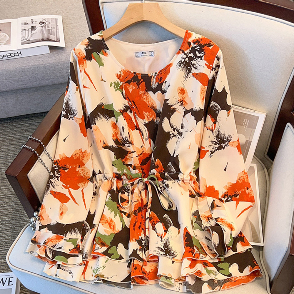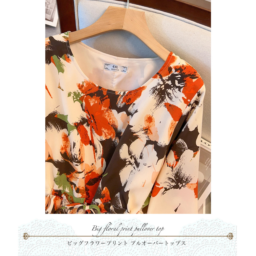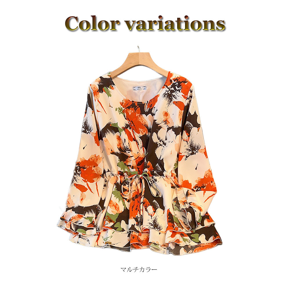 サイズが豊富!印象画風花柄. 裾ダブルフリル プルオーバーブラウス sanmaru