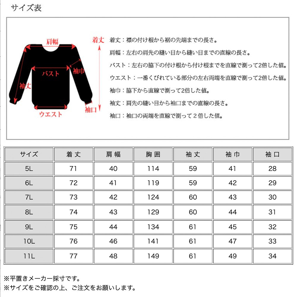 サイズ表記 5L 6L 7L 8L 9L 10L 11L 着丈 71cm 72cm 73cm 74cm 75cm 76cm 77cm 肩幅 40cm 41cm 42cm 43cm 44cm 46cm 48cm 胸囲 114cm 119cm 124cm 129cm 134cm 141cm 149cm 袖丈 59cm 59cm 60cm 60cm 61cm 61cm 61cm 袖巾 41cm 42cm 43cm 44cm 45cm 47cm 49cm 袖口 28cm 29cm 30cm 31cm 32cm 33cm 34cm