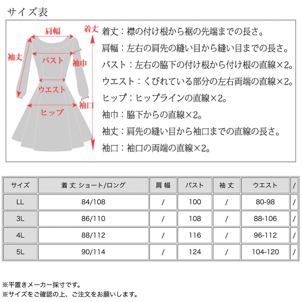 サイズ表記 LL 3L 4L 5L 着丈 84cm 86cm 88cm 90cm バスト 100cm 108cm 116cm 124cm ウエスト 80-98cm 88-106cm 96-112cm 104-120cm
