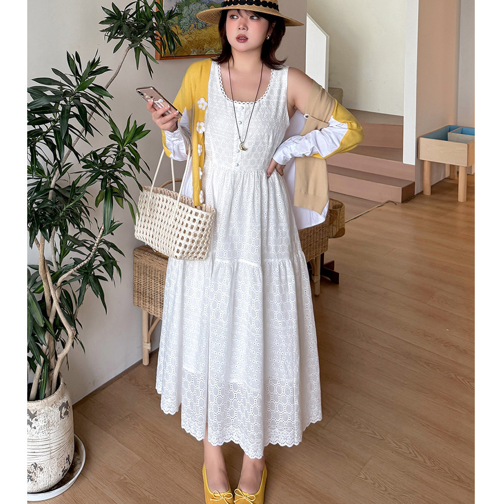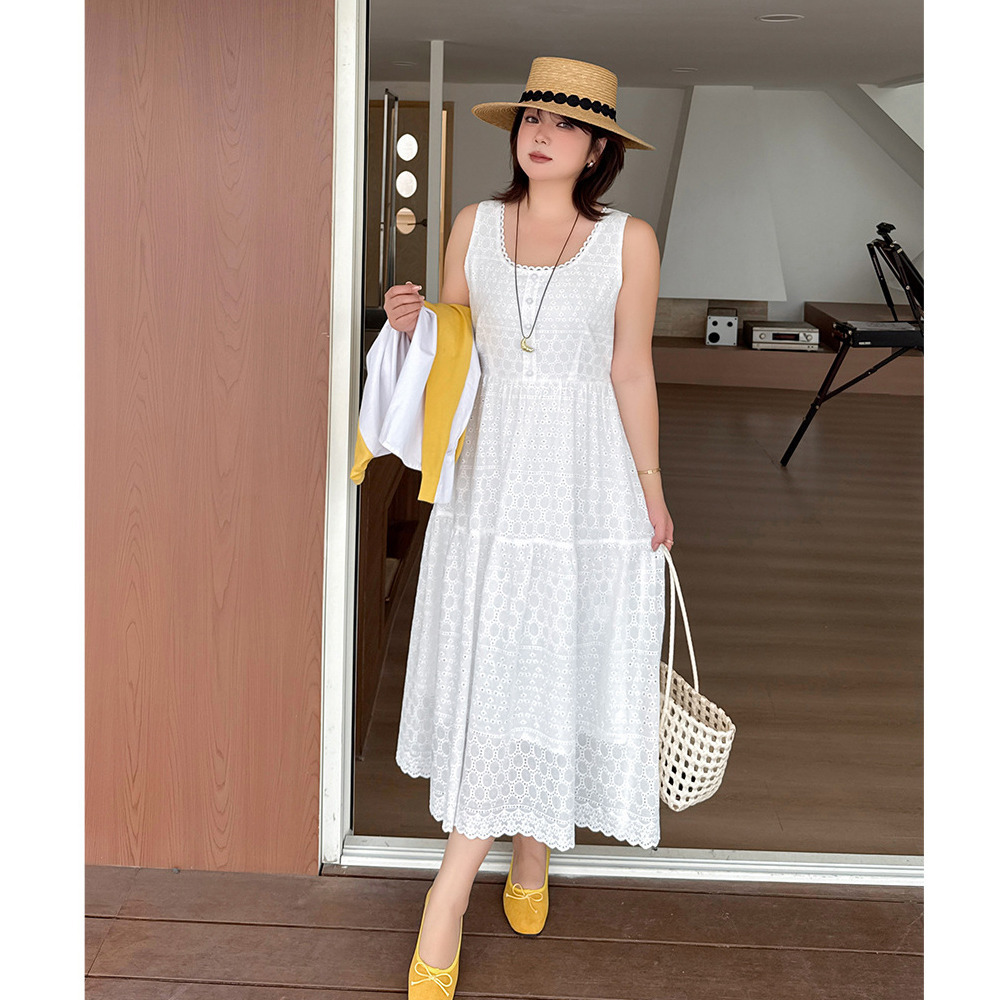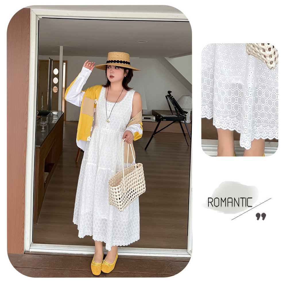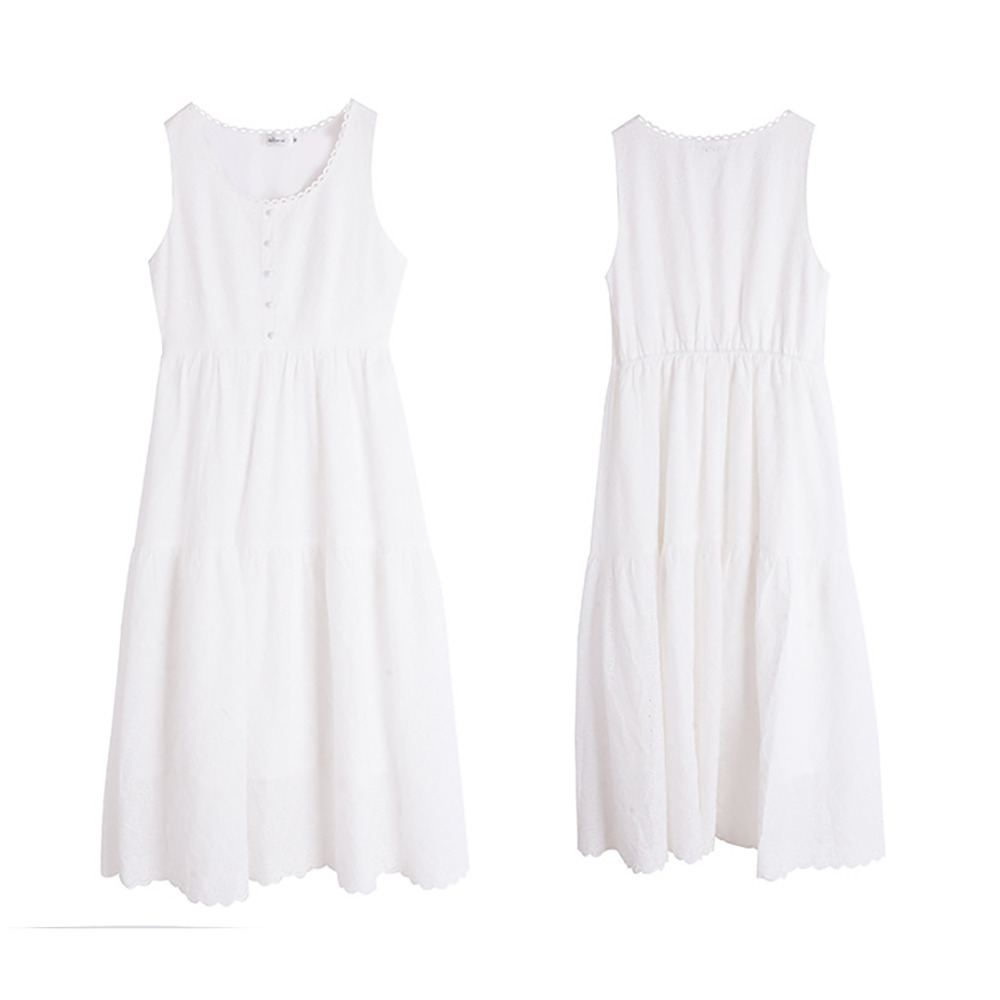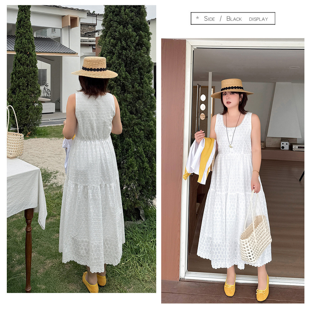 レトロな中空レースのノースリーブ 2段ティアードワンピース