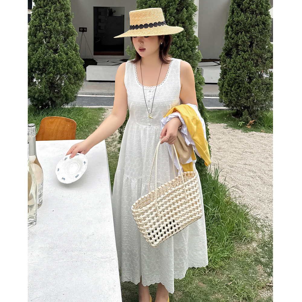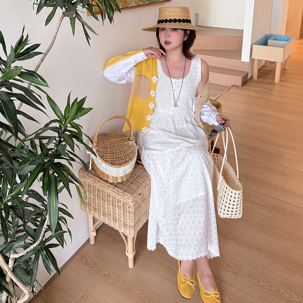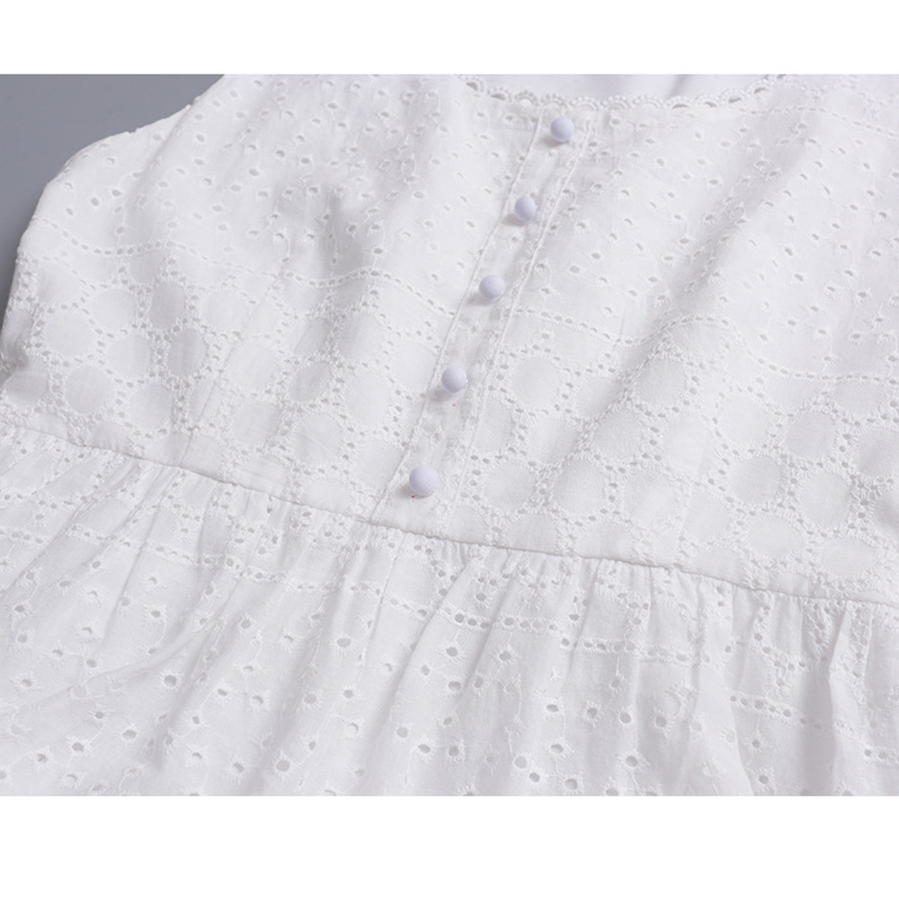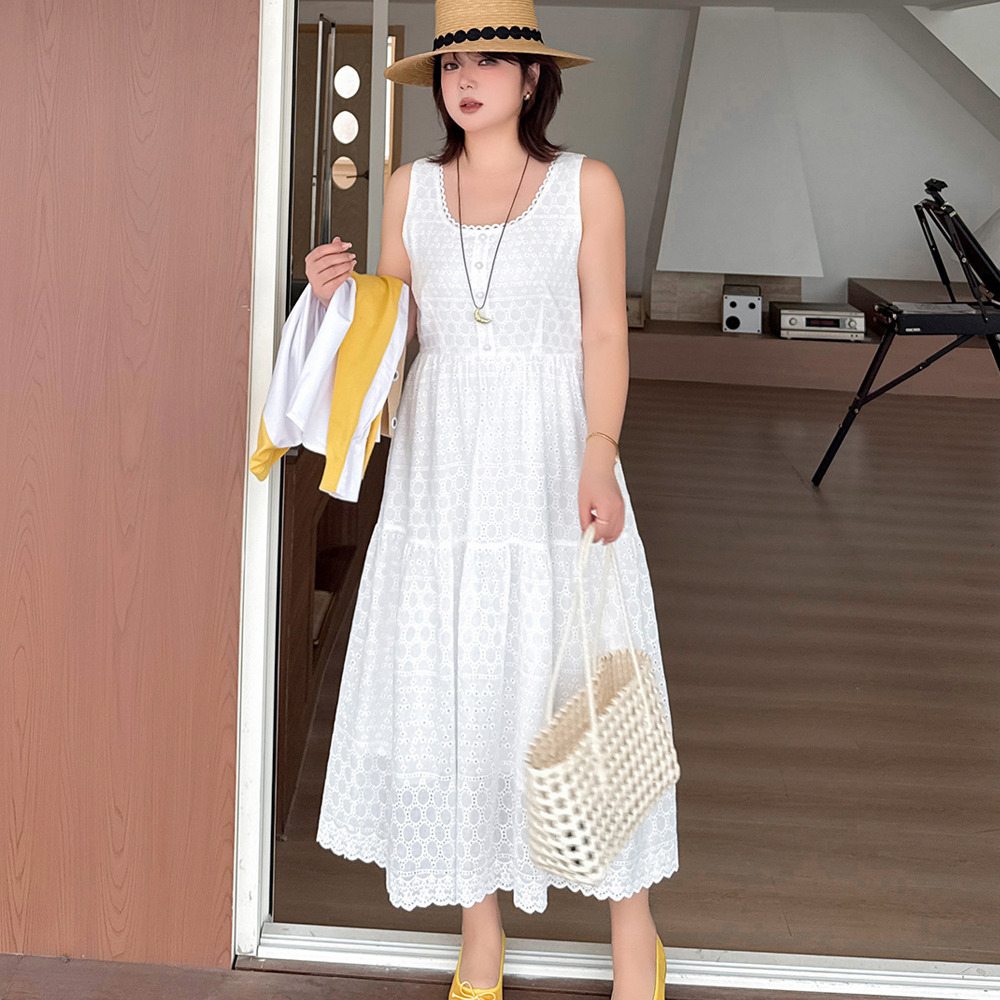 レトロな中空レースのノースリーブ 2段ティアードワンピース