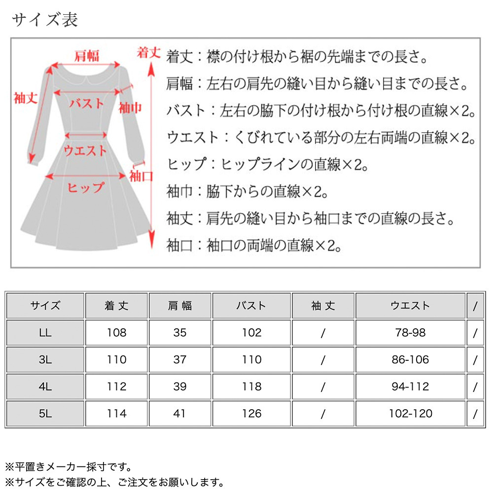 サイズ表記 LL 3L 4L 5L 着丈 108cm 110cm 112cm 114cm 肩幅 35cm 37cm 39cm 41cm バスト 102cm 110cm 118cm 126cm ウエスト 78-98cm 86-106cm 94-112cm 102-120cm