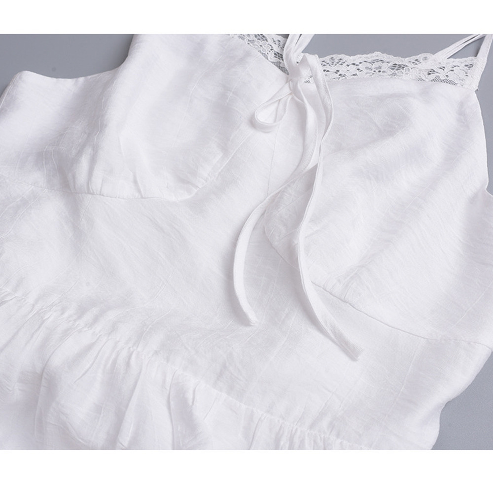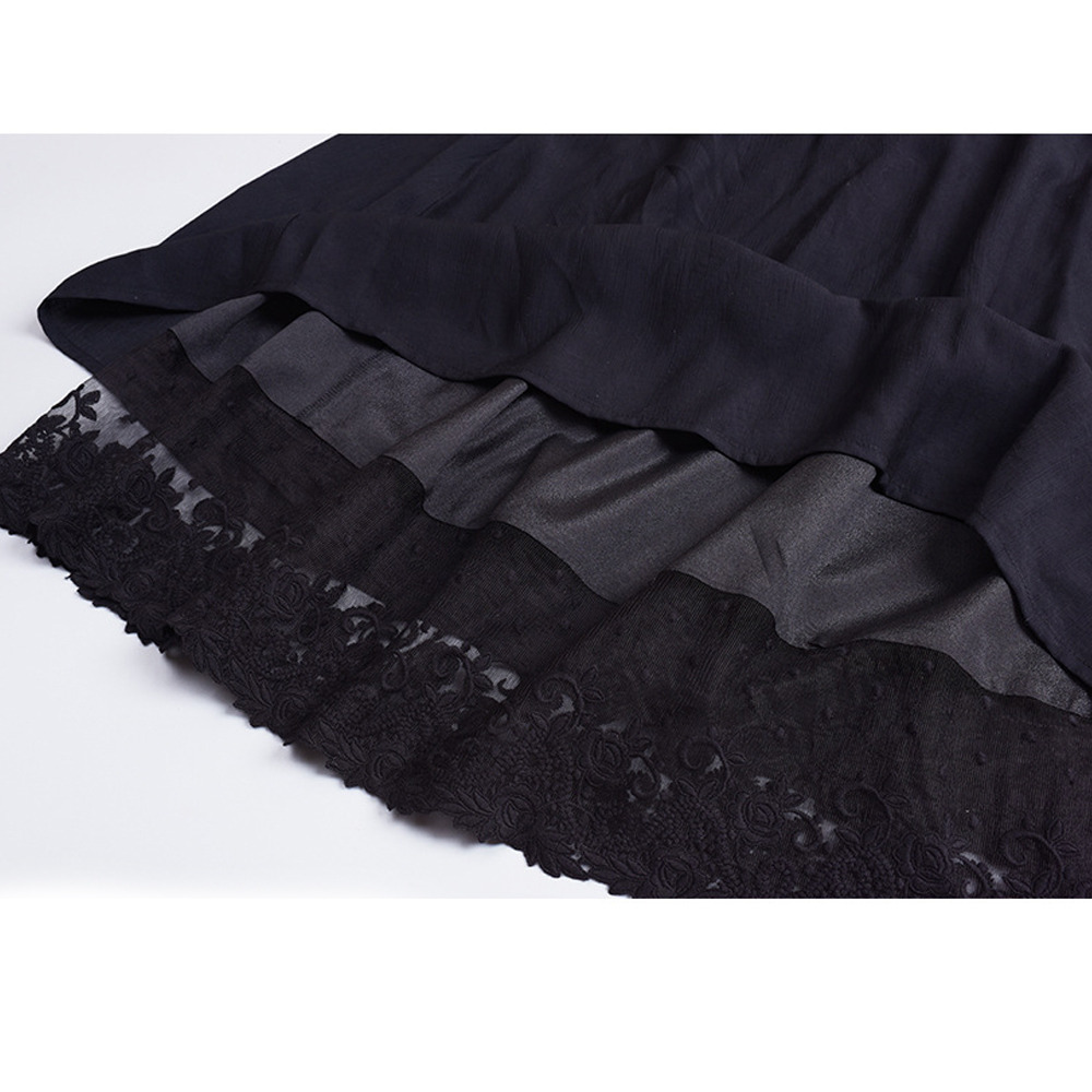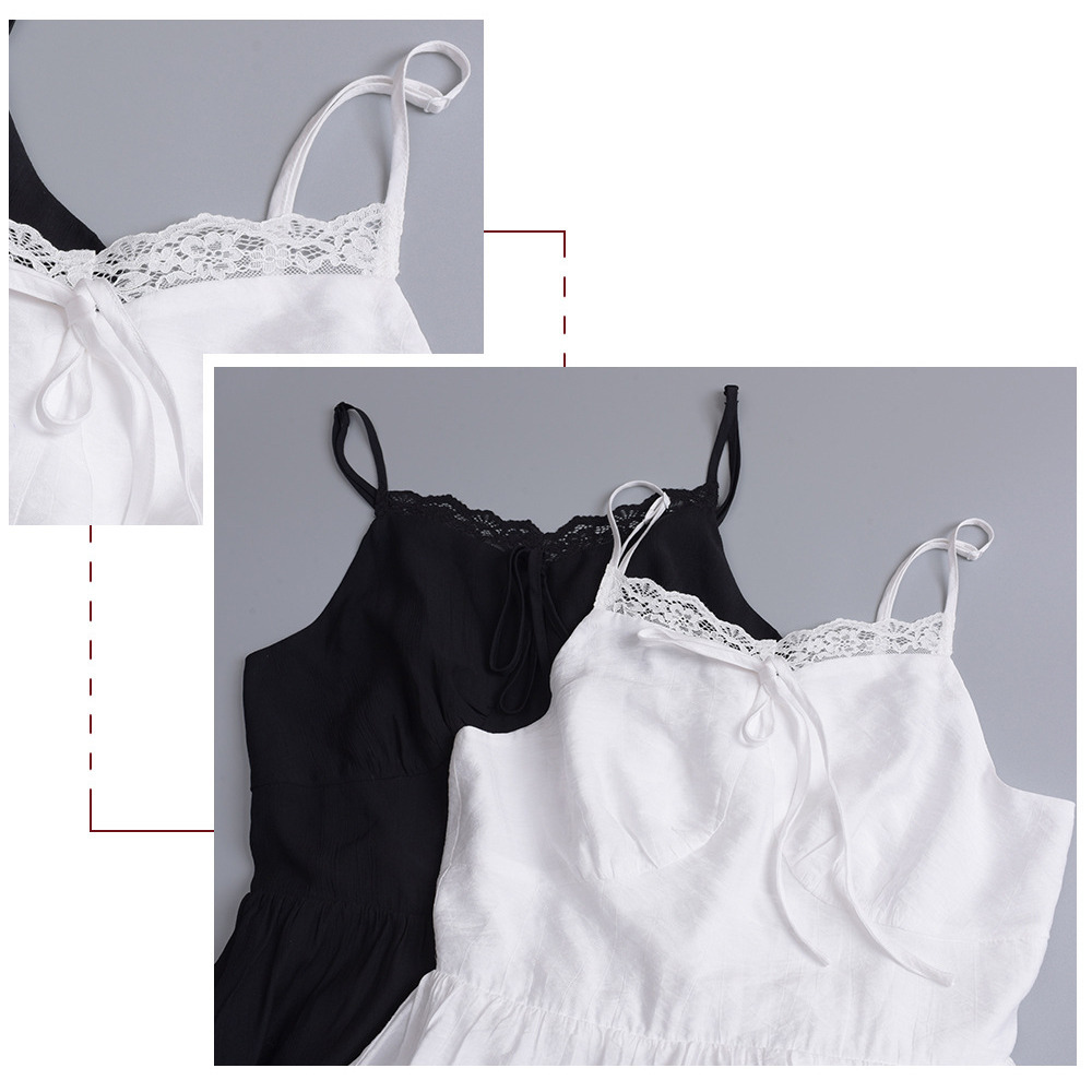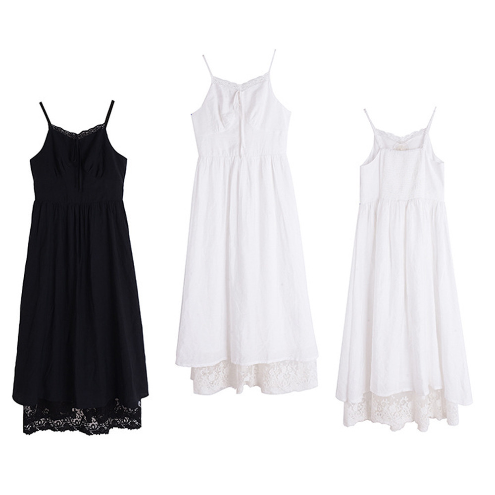 裾にレースをコラージュしたクレープ素材のサスペンダーワンピース