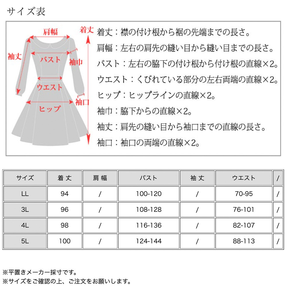 サイズ表記 LL 3L 4L 5L 着丈 94cm 96cm 98cm 100cm バスト 100-120cm 108-128cm 116-136cm 124-144cm ウエスト 70-95cm 76-101cm 82-107cm 88-113cm