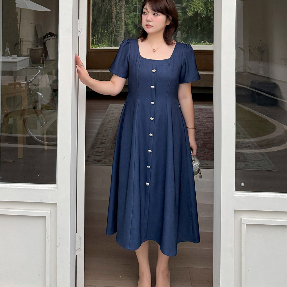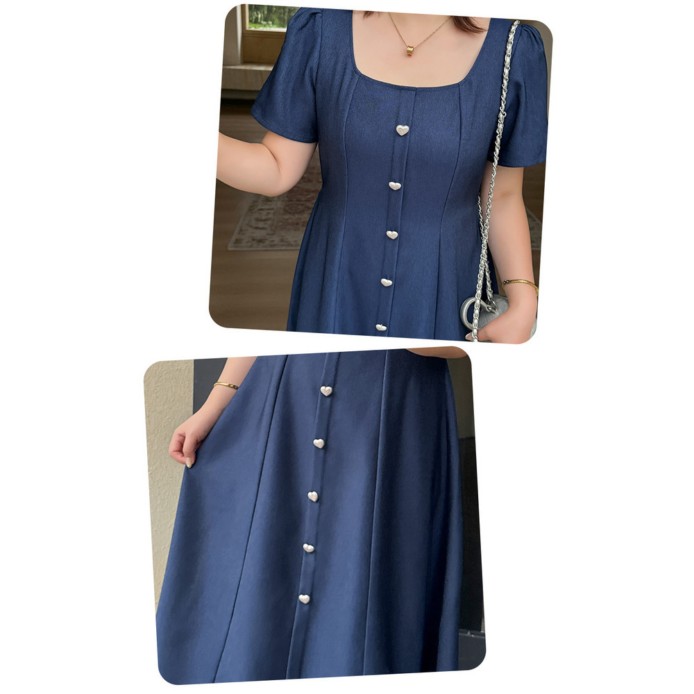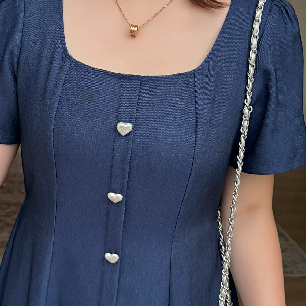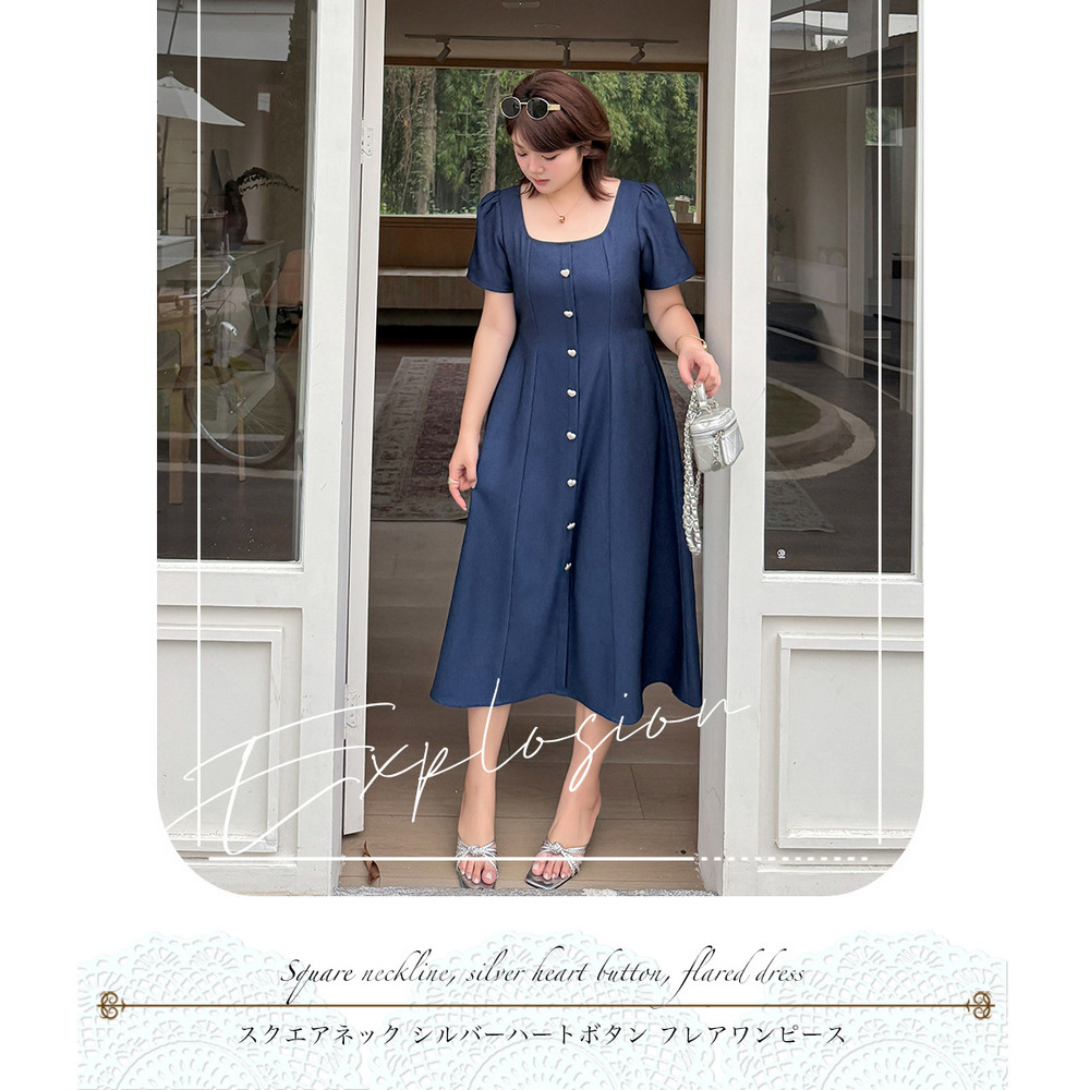 マットシルバーハートボタン飾り スクエアネックフレアワンピース